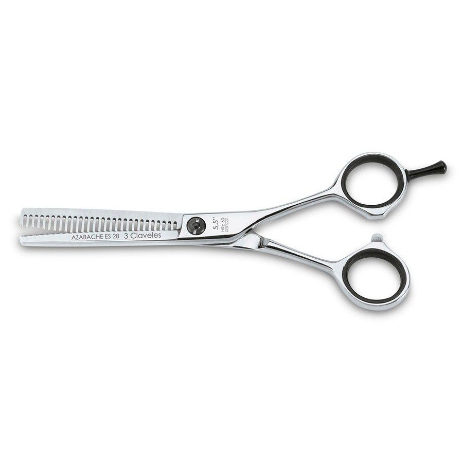 Ножницы филировочные Azabache ES 12793 от испанского бренда 3Claveles имеют симметричное расположение колец, одну филировочную кромку с 28 зубцами, длину 5,5 дюймов и регулируемый винт натяжения полотен.Незаменимы для создания структур, объёма и плавных незаметных переходов в стрижке, придания формы волосам.