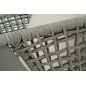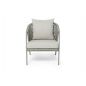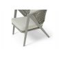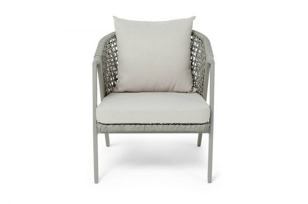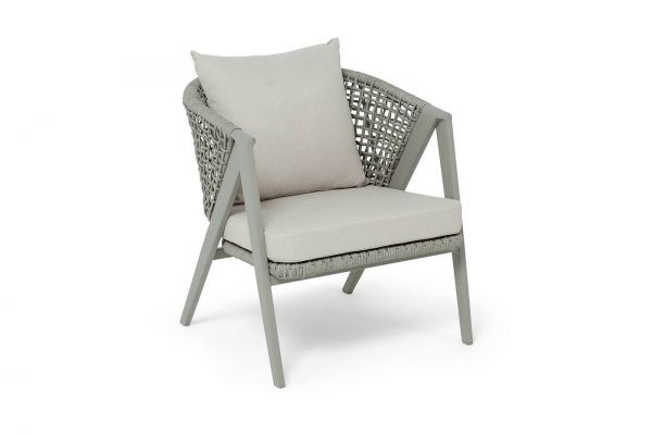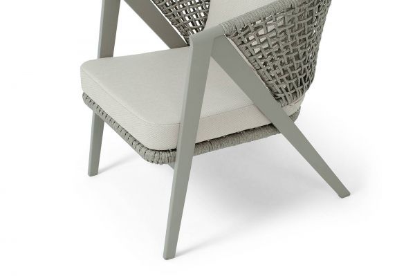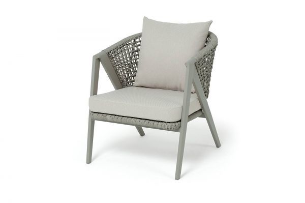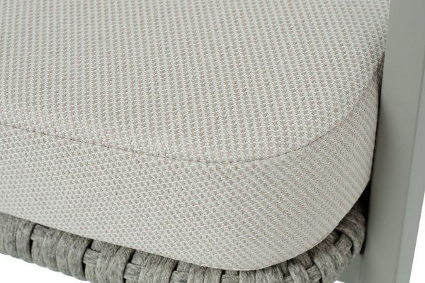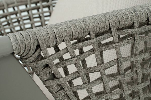 Плетеное кресло «Амстердам» для обустройства обеденной или лаунж-зоны. Изготовлен из алюминиевого каркаса, оплетенного вручную эластичными синтетическими лентами из высокопрочных полиэфирных волокон. Роуп является гипоаллергенным, прочным, износостойким и устойчивым к ультрафиолету. Приятный на ощупь и напоминает шерстяное плетение. Цвет каркаса и оплетки – серый. На ножках кресла идут серые пластиковые наконечники (заглушки). Подушки состоят из наполнителя и съёмных чехлов, которые обработаны влагоотталкивающей пропиткой бежевого цвета. Чехол можно стирать в стиральной машине с использованием порошков.
