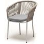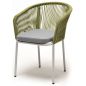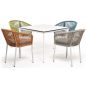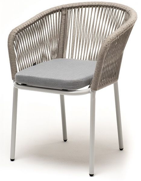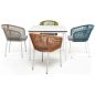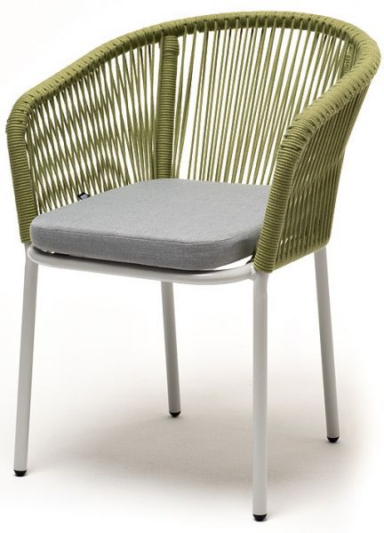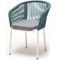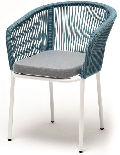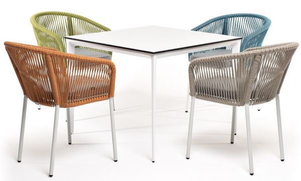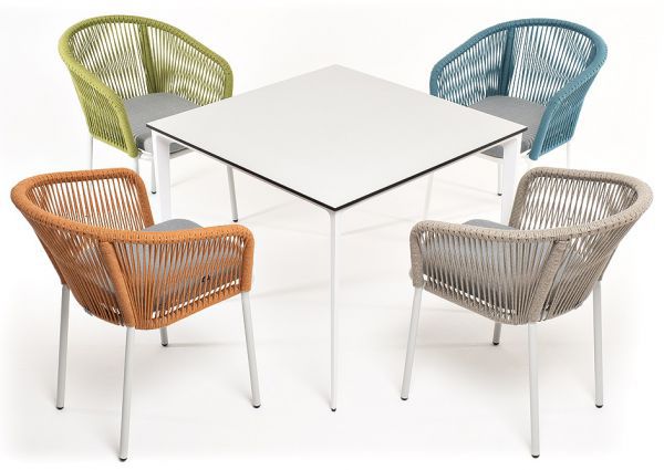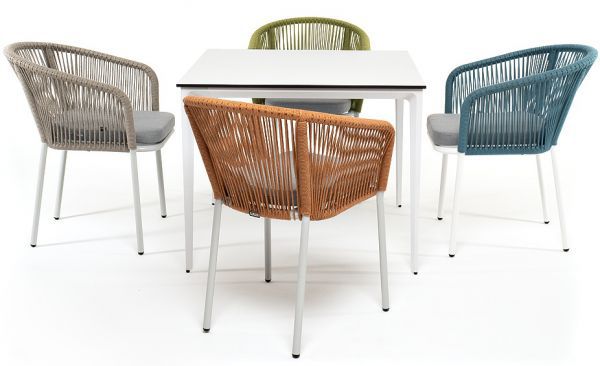 Комплект «Аркобалено» для обустройства обеденной зоны, рассчитан на 4 персоны. Столешница стола «Малага» выполнена из современного высококачественного монолитного компакт-пластик HPL, толщиной 12 мм в молочном цветом. Материал устойчив к высоким температурам, попаданию влаги и может использоваться при любых погодных условиях. Подстолье изготовлено из крашеного алюминия белого цвета. Каркас стульев выполнен из алюминия. Оплетка выполнена вручную современным материалом - роупом. Цвет оплетки - бирюзовый, салатовый меланж, оранжевый меланж и серый меланж. В комплект входят подушки со съёмными водоотталкивающими чехлами светло-серого цвета.