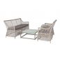 Оплетка выполнена вручную искусственным ротангом бежевого цвета, диван и кресло укомплектованы подушками из 100% полиэстера, которые пропитаны специальным составом, обладающим влагоотталкивающим свойством.