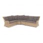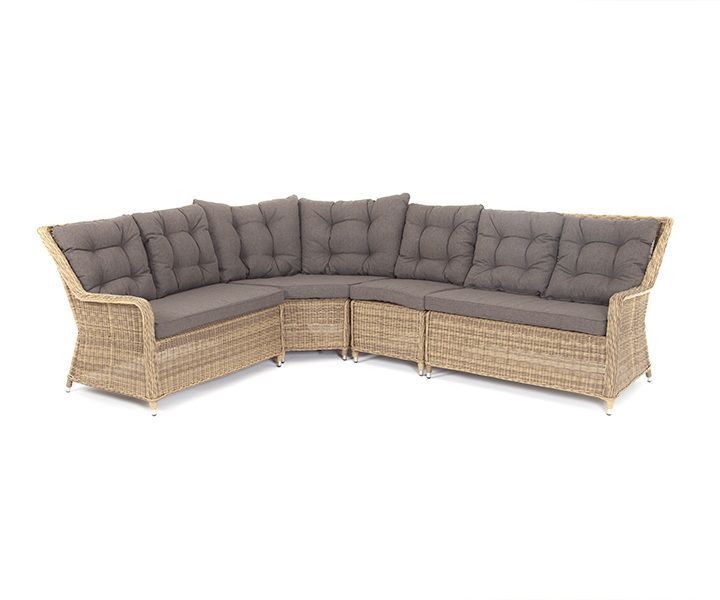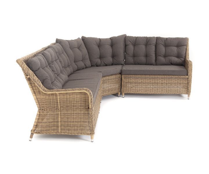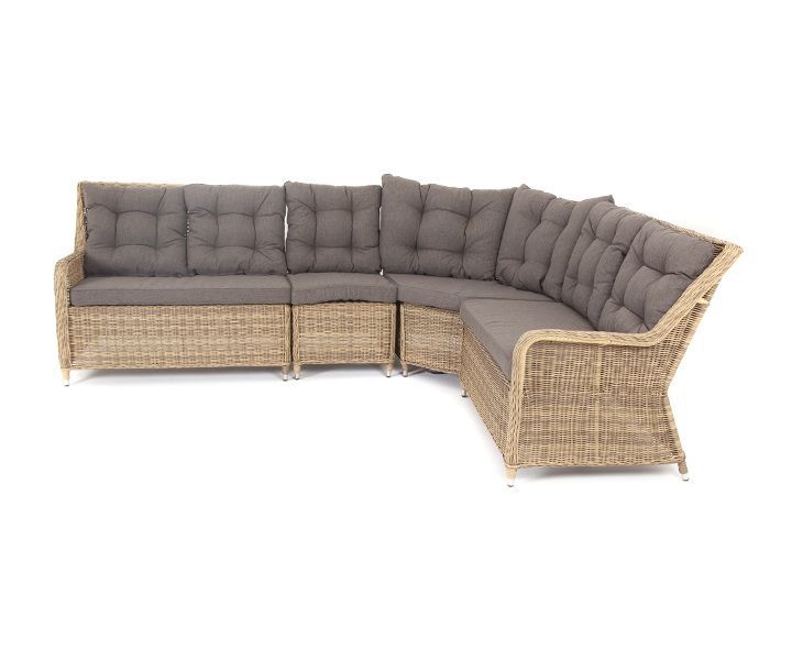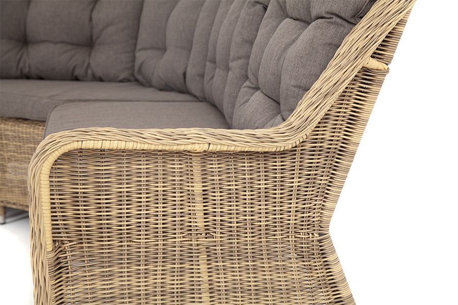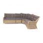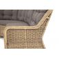 Модульный диван из искусственного ротанга "Бергамо" имеет угловую форму. Модель произведена из круглого искусственного ротанга соломенного цвета и укомплектована мягкими подушками из полиэстера с влагоотталкивающей тканью. В основе дивана - прочный алюминиевый каркас.