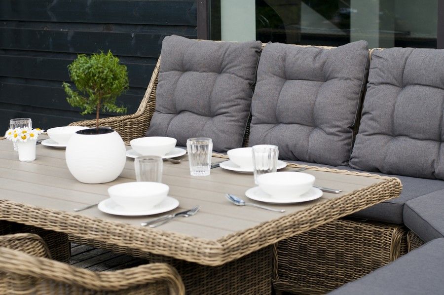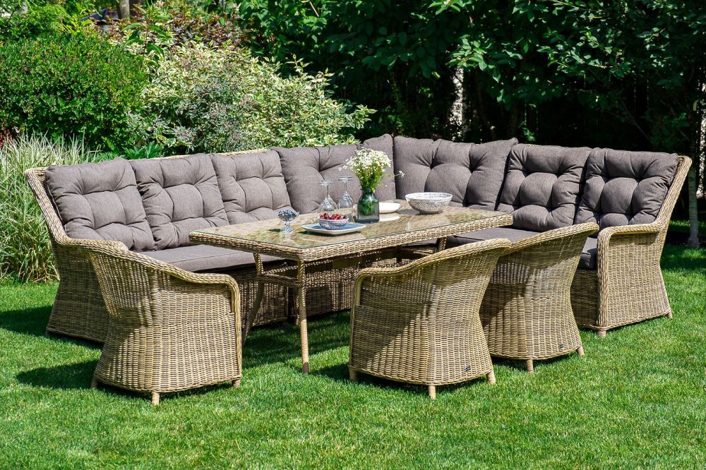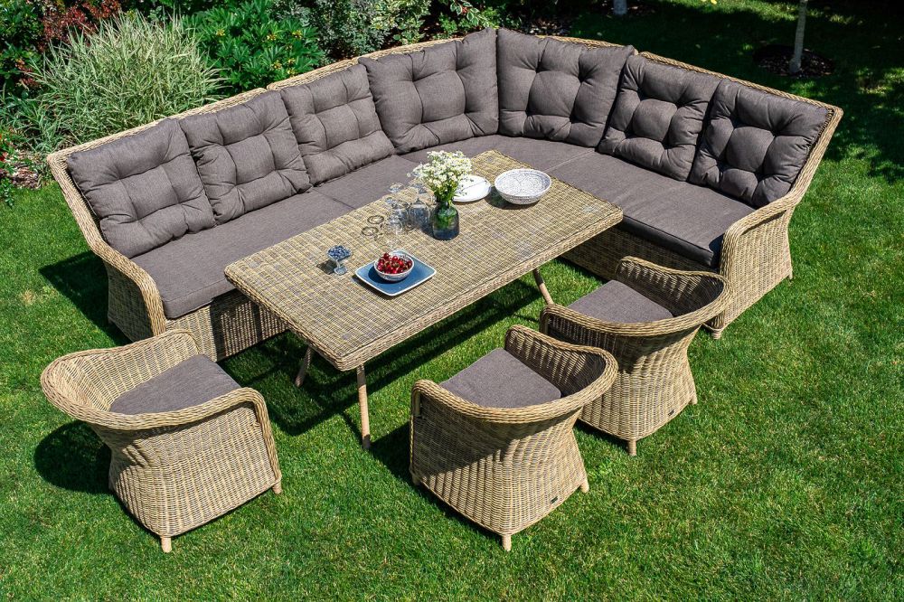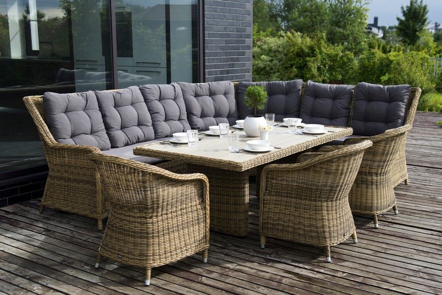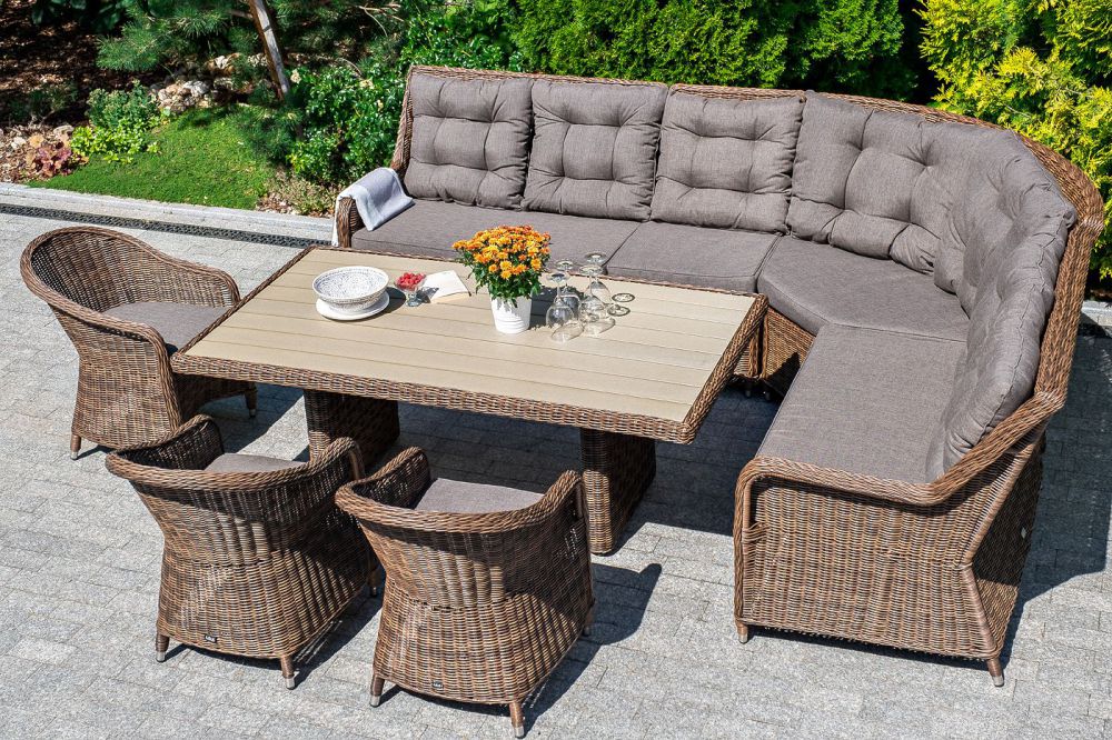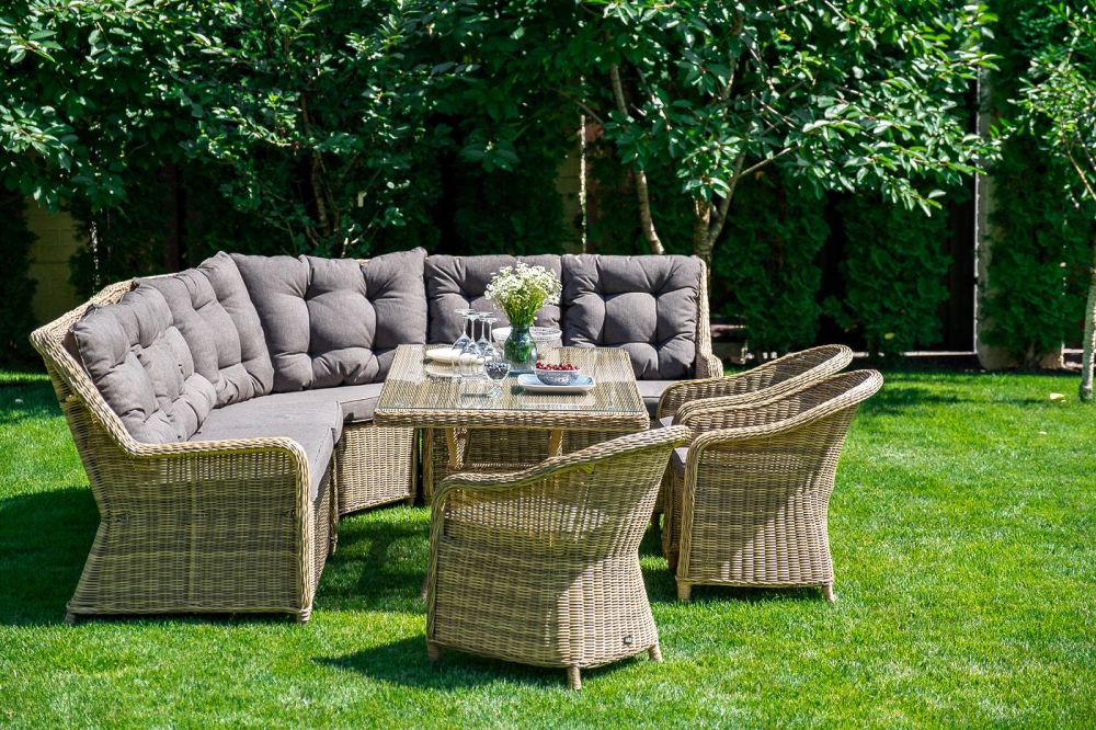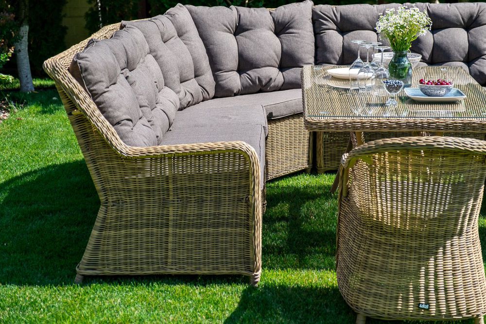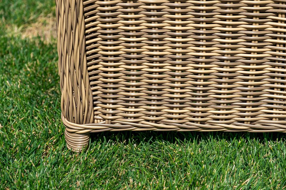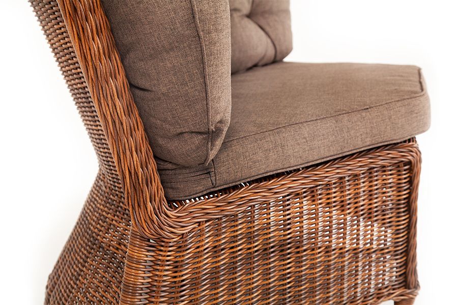 Плетеный угловой диванный модуль "Бергамо" изготовлен из алюминиевого каркаса, вручную оплетенного круглым искусственным ротангом.