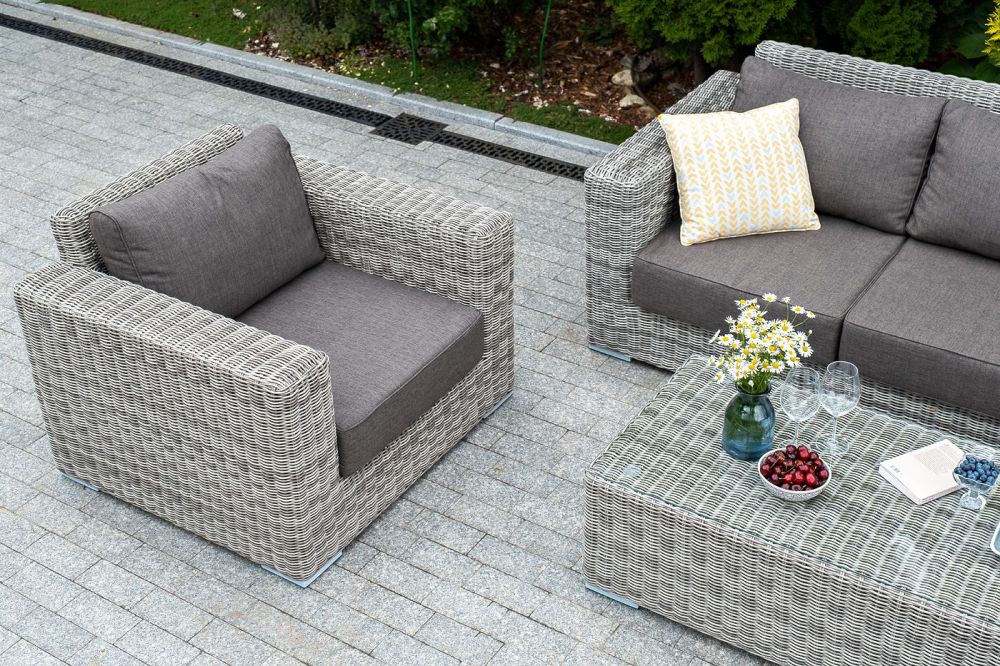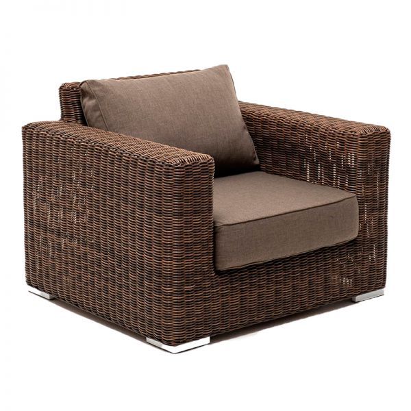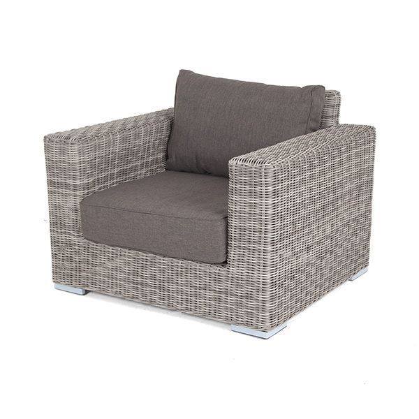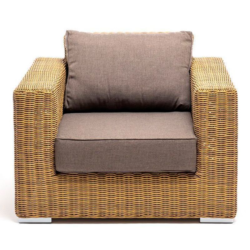 "Боно" плетеное кресло, алюминиевый каркас, круглый искусственный ротанг, ручное плетение, толщина подушки - 150 мм, размер - 1000*900*775 мм, цвет серый, вес - 23 кг.
