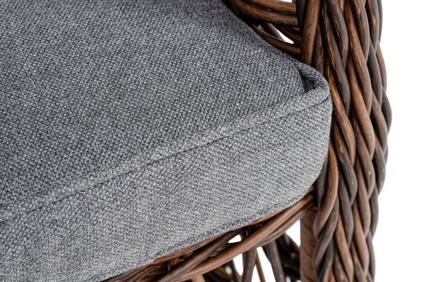 Садовое кресло располагает двумя мягкими подушками, которые идут в комплекте. Они выполнены в сером цвете. Полиэстер высокого качества используется при пошиве тканевых изделий. Его плотность 300гр/м2. Ткань обрабатывается влагоотталкивающей пропиткой.