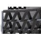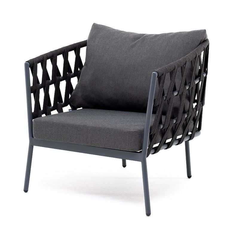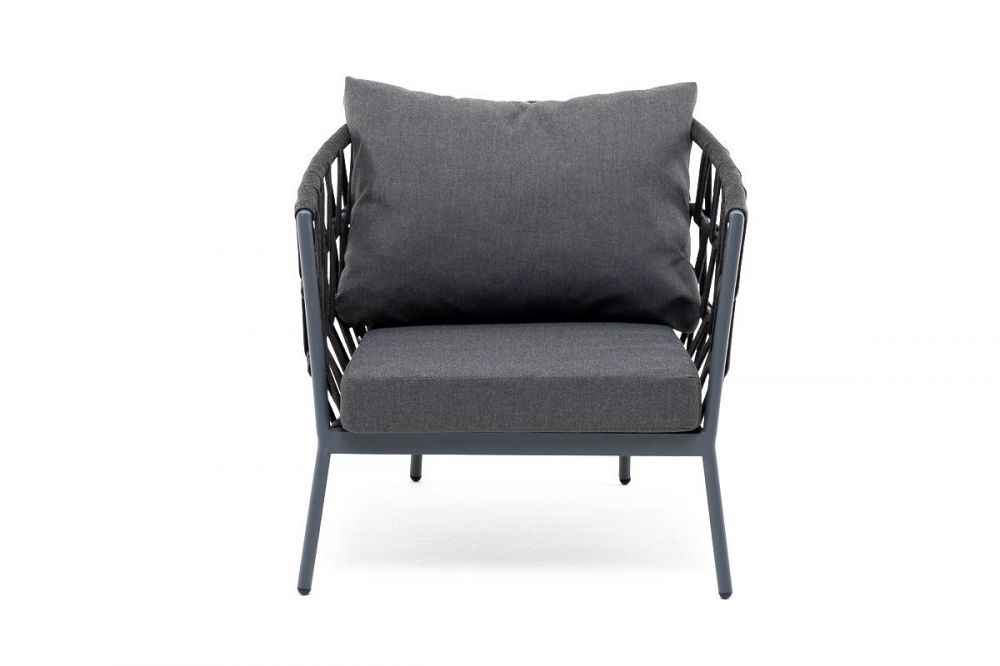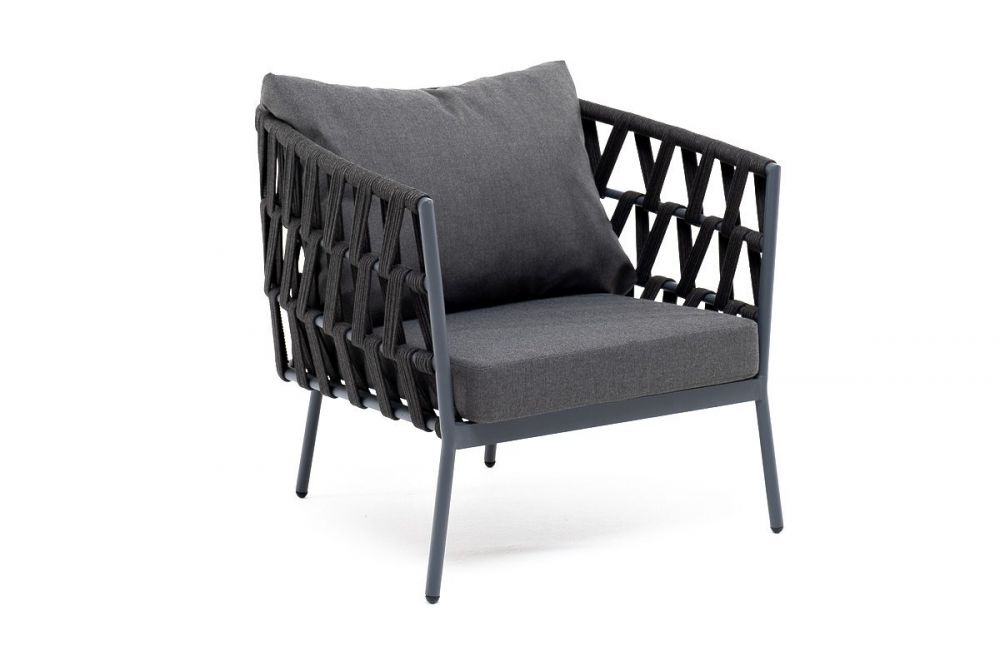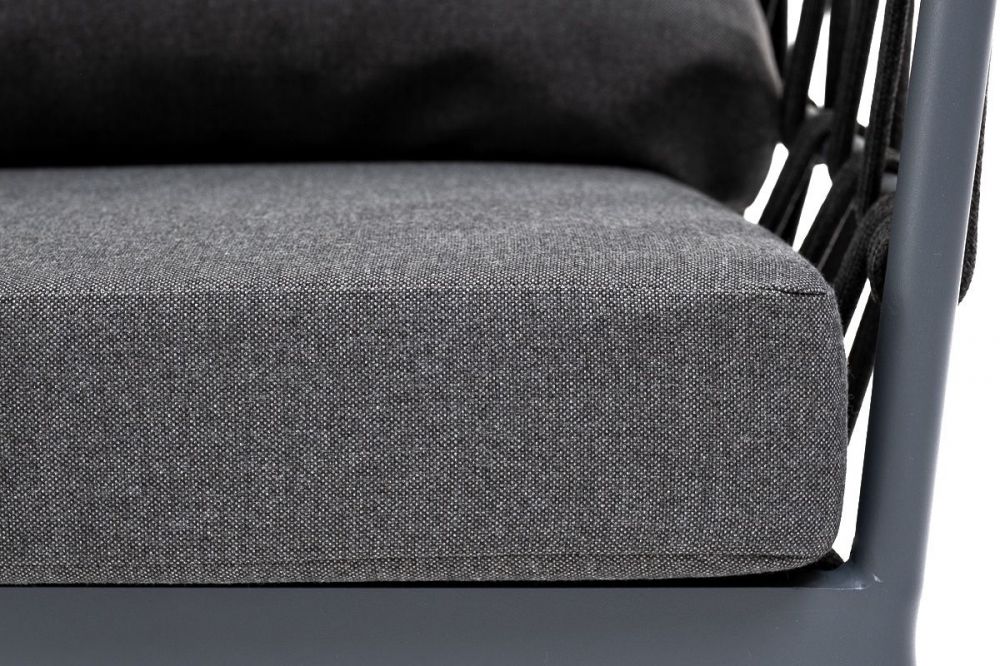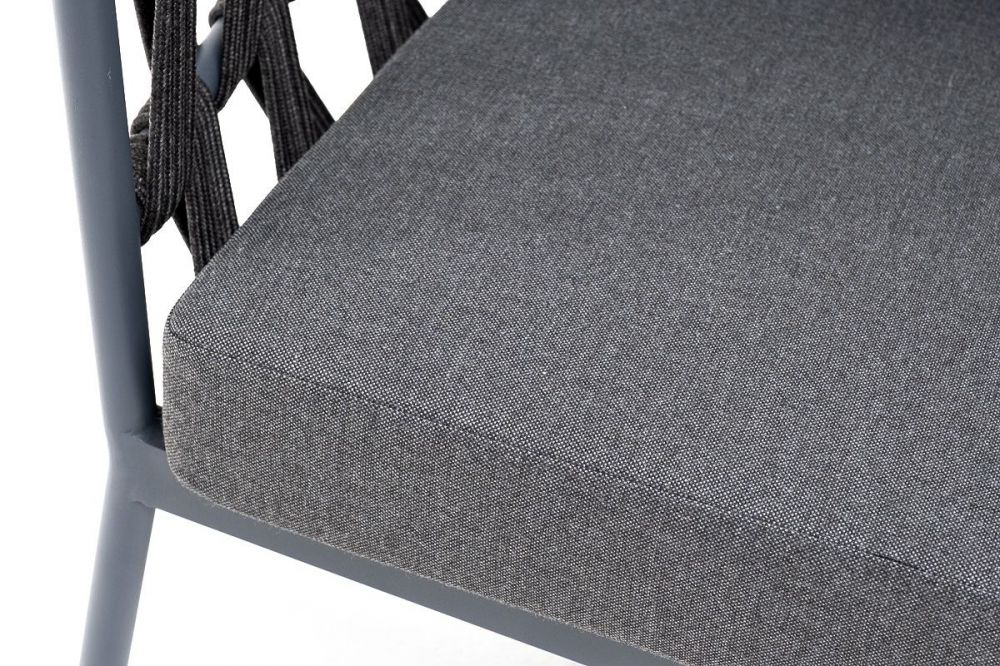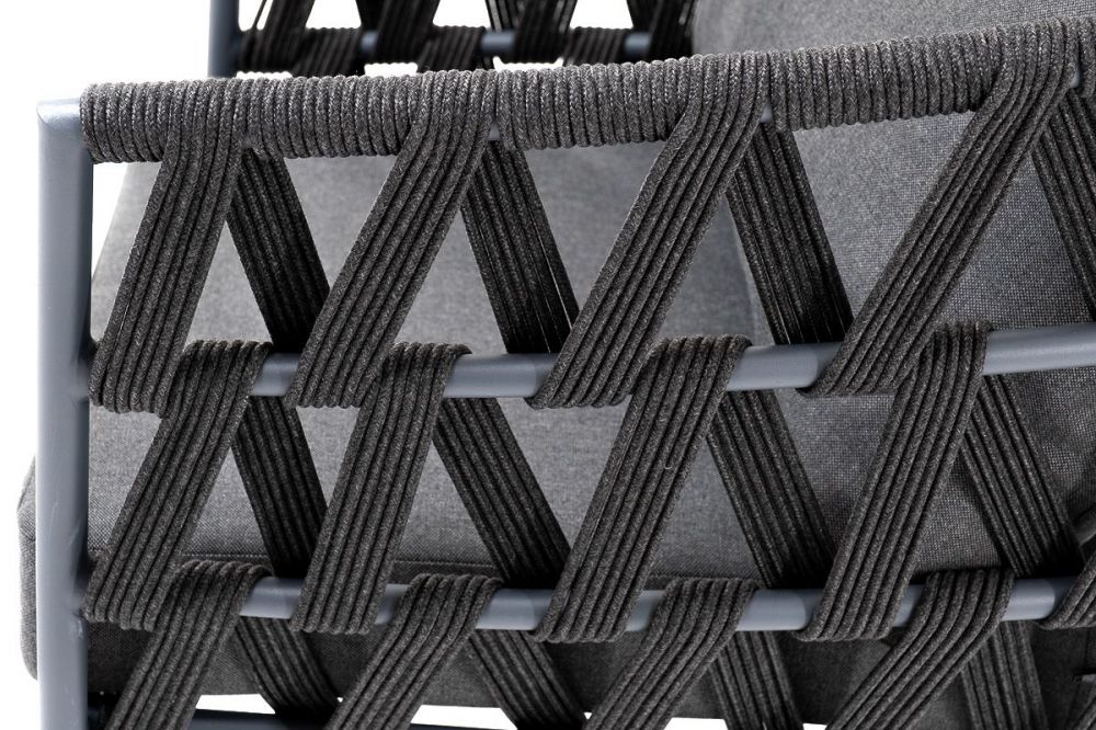 Кресло имеет алюминиевый каркас, окрашенный порошковой краской в темно-серый (RAL7024) цвет. Боковины каркаса вручную оплетены роупом - эластичными синтетическими лентами, изготовленными из высокопрочных полиэфирных волокон. Цвет оплетки - темно-серый.