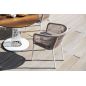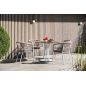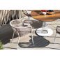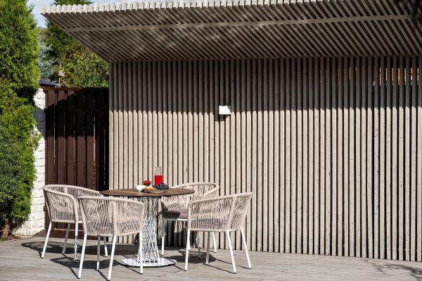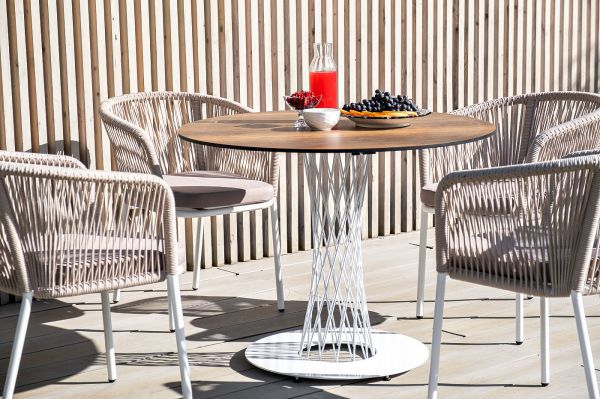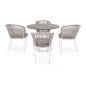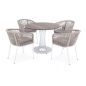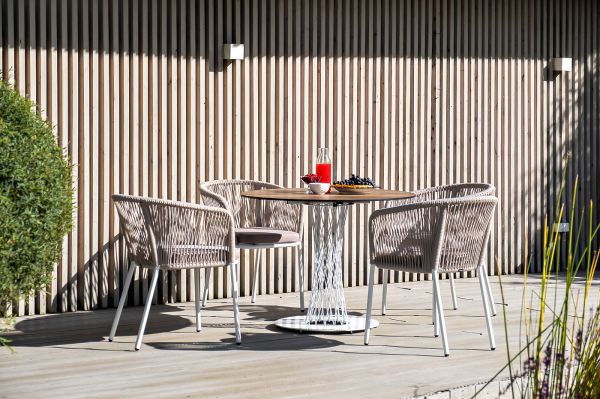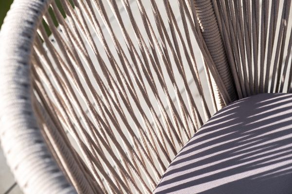 4 кресла из коллекции «Марсель», выполненных из алюминиевого каркаса и ручной оплетки роупом. Это эластичные синтетические ленты из высокопрочных полиэфирных волокон, представлены в бежевом цвете.
