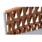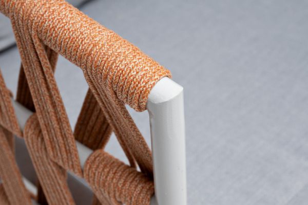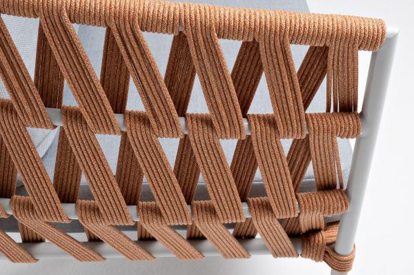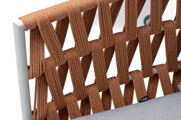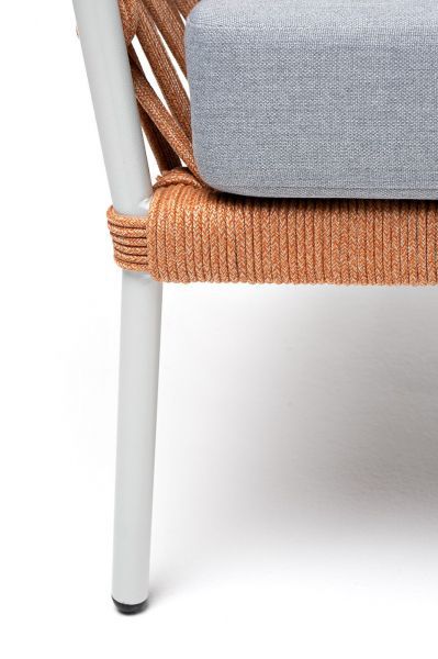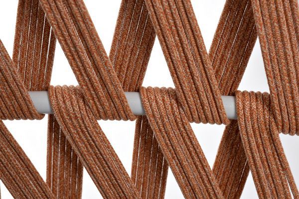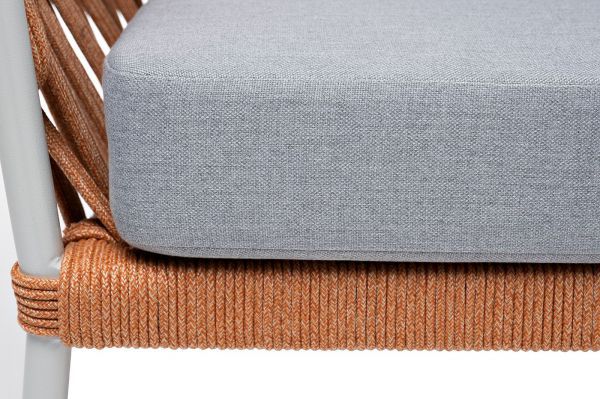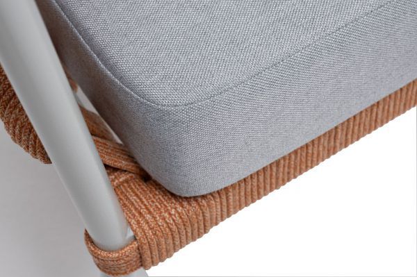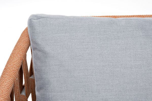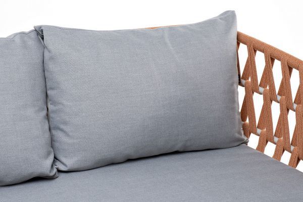 Диван имеет алюминиевый каркас, окрашенный порошковой краской в светло-серый (RAL7035) цвет. Боковины каркаса и спинка вручную оплетены роупом - эластичными синтетическими лентами, изготовленными из высокопрочных полиэфирных волокон.