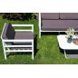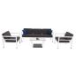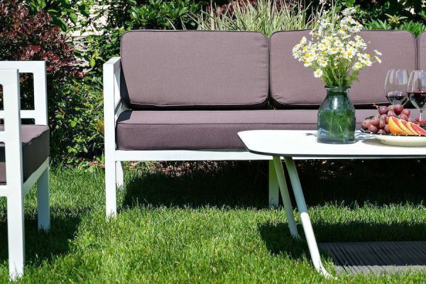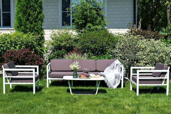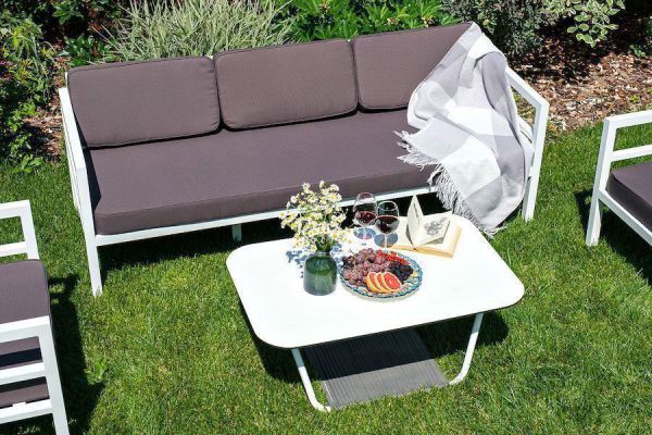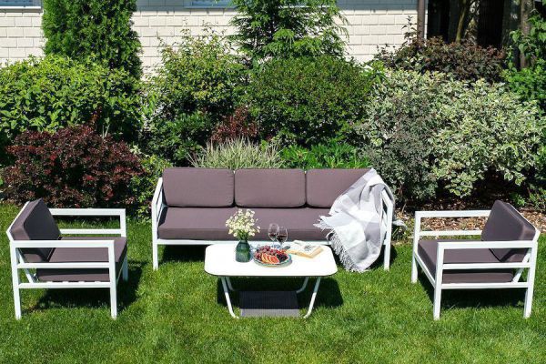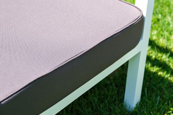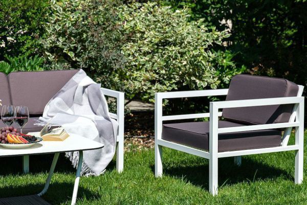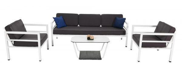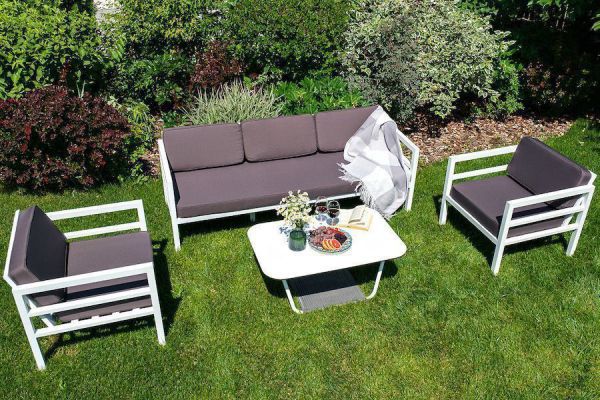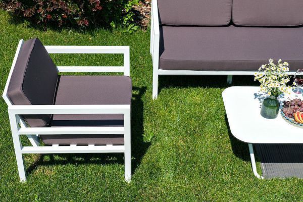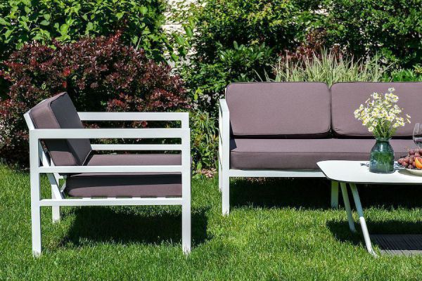 Каркас дивана и кресел выполнен из прочного алюминия и окрашен в белый цвет. Комплект дополняют подушки со съемными чехлами и водоотталкивающей пропиткой темно-серого цвета. Материал чехлов - 100% полиэстер плотностью 230гр/м2.