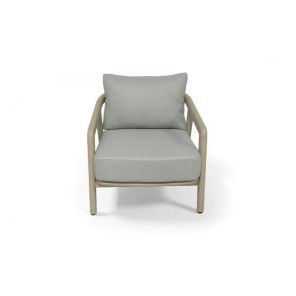 Кресло изготовлена из устойчивого алюминиевого каркаса. Искусственный ротанг украшает мебель в качестве круглого ручного плетения. Оно представлено в бежевом цвете.
