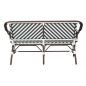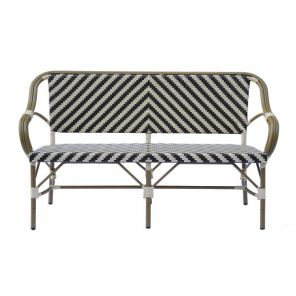 Каркас выполнен из алюминия, окрашенного износостойкой краской бронзовый оттенка. Конструкция имеет изогнутую трубчатую опору диаметром 28×1,5 мм. Плетение выполнено вручную из плоского искусственного ротанга 12×1,3 мм. Цвет оплетки - черно-белый. Широкая спинка стула позволяет комфортно расположиться, а сидение расслабиться. Диван легко очищается от загрязнений, удобен в эксплуатации. Ножки оснащены специальными заглушками, которые защищают их от влаги и улучшают устойчивость на неровной поверхности.