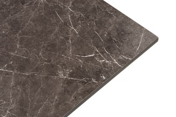 Интерьерный круглый стол «Каффе» со столешницей из HPL в цвете «серый мрамор». Это высококачественный ударопрочный компакт-пластик, обладающий низкой пористостью, что предотвращает впитывание жидкостей, поэтому столы из HPL идеально подходит для обеденных зон.
