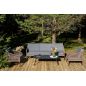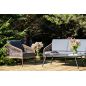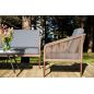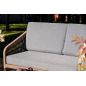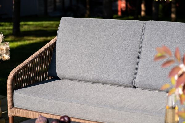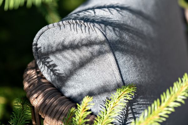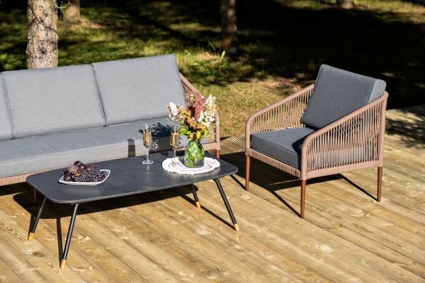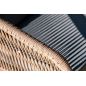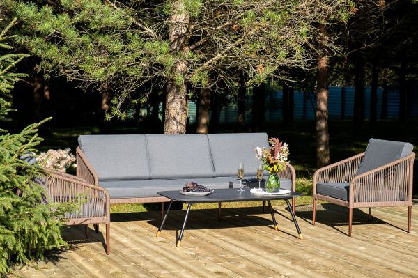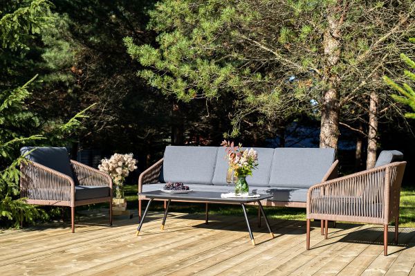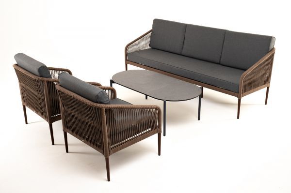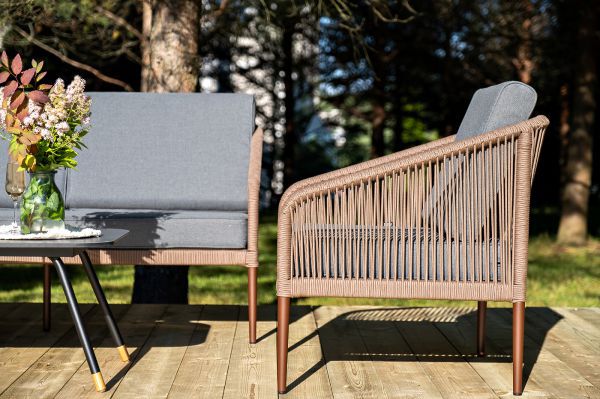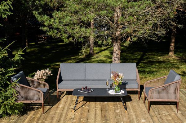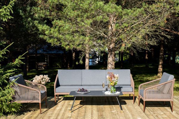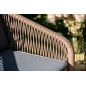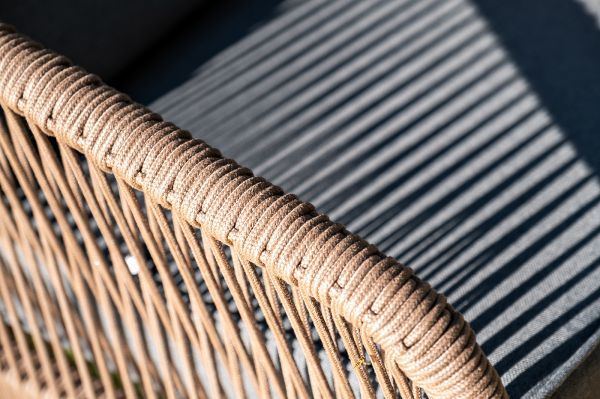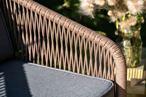 Каркас уличной мебели выполнен из износостойкого алюминия. Его дополняет коричневая ручная оплетка, изготовленная на основе эластичных синтетических лент из полиэфирных волокон высокой прочности.