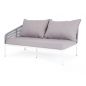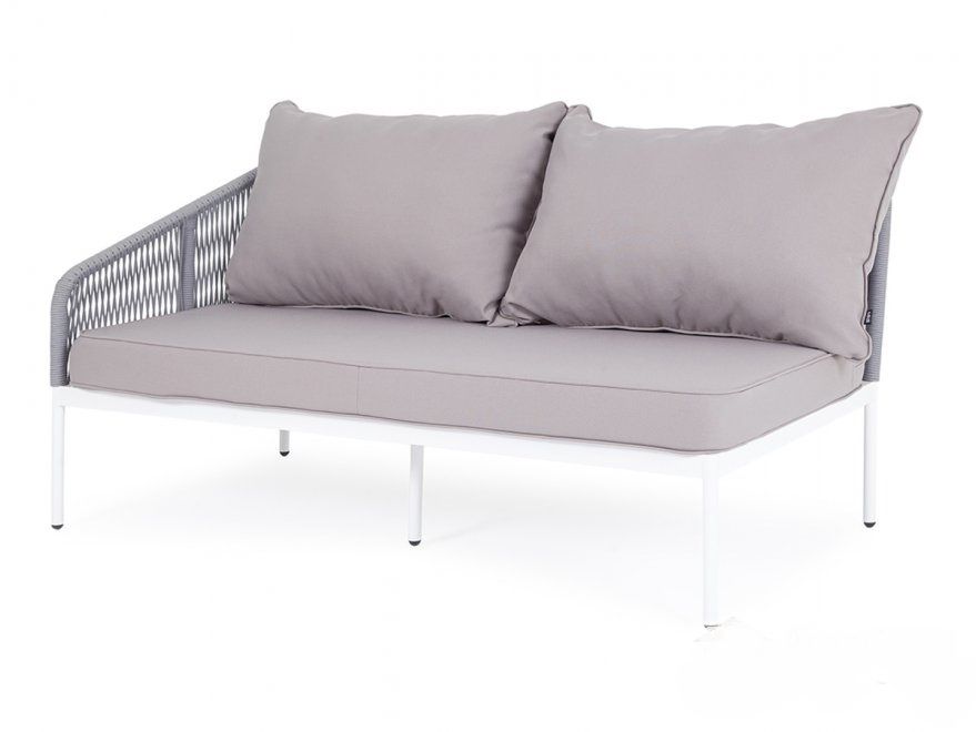 Диванный модуль "Канны" правосторонний из комплекта трансформирующегося одноименного дивана. Модуль имеет алюминиевый каркас, окрашенный порошковой краской в белый цвет. Боковины каркаса вручную оплетены роупом - эластичными синтетическими лентами, изготовленными из высокопрочных полиэфирных волокон. Цвет оплетки - светло-серый.