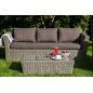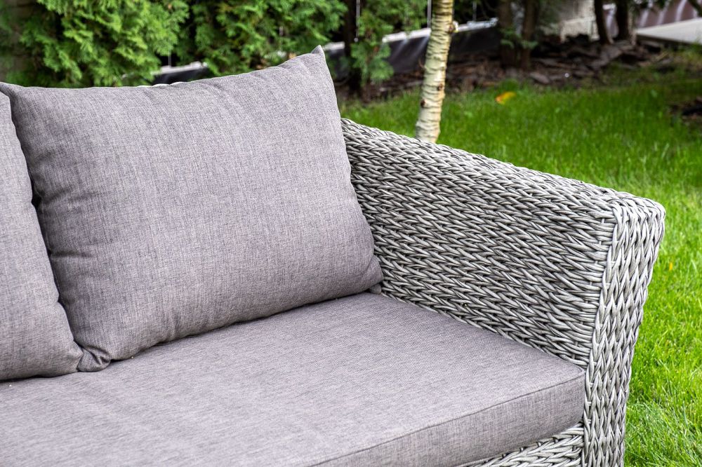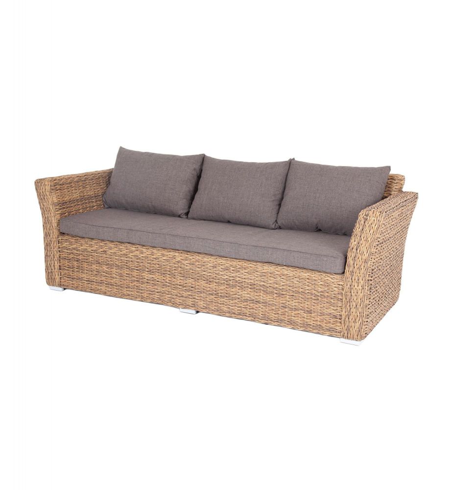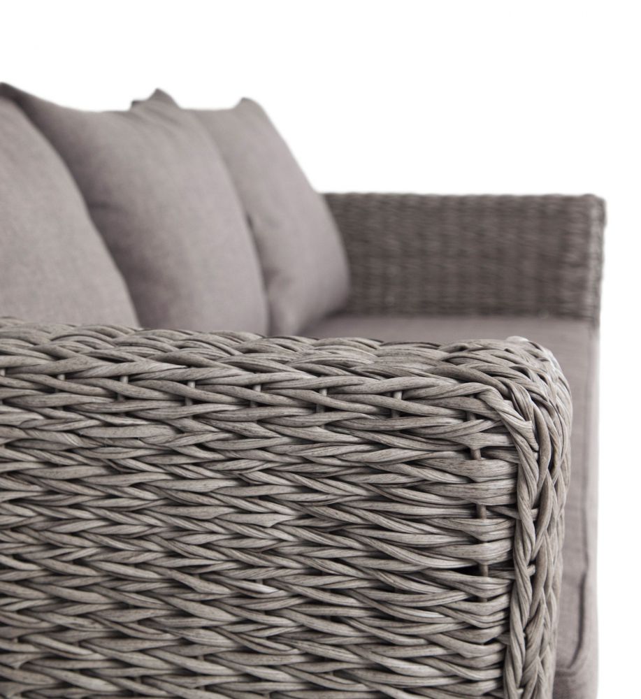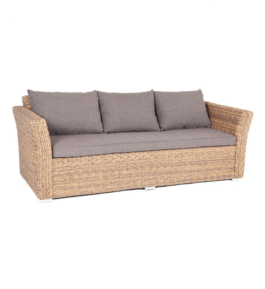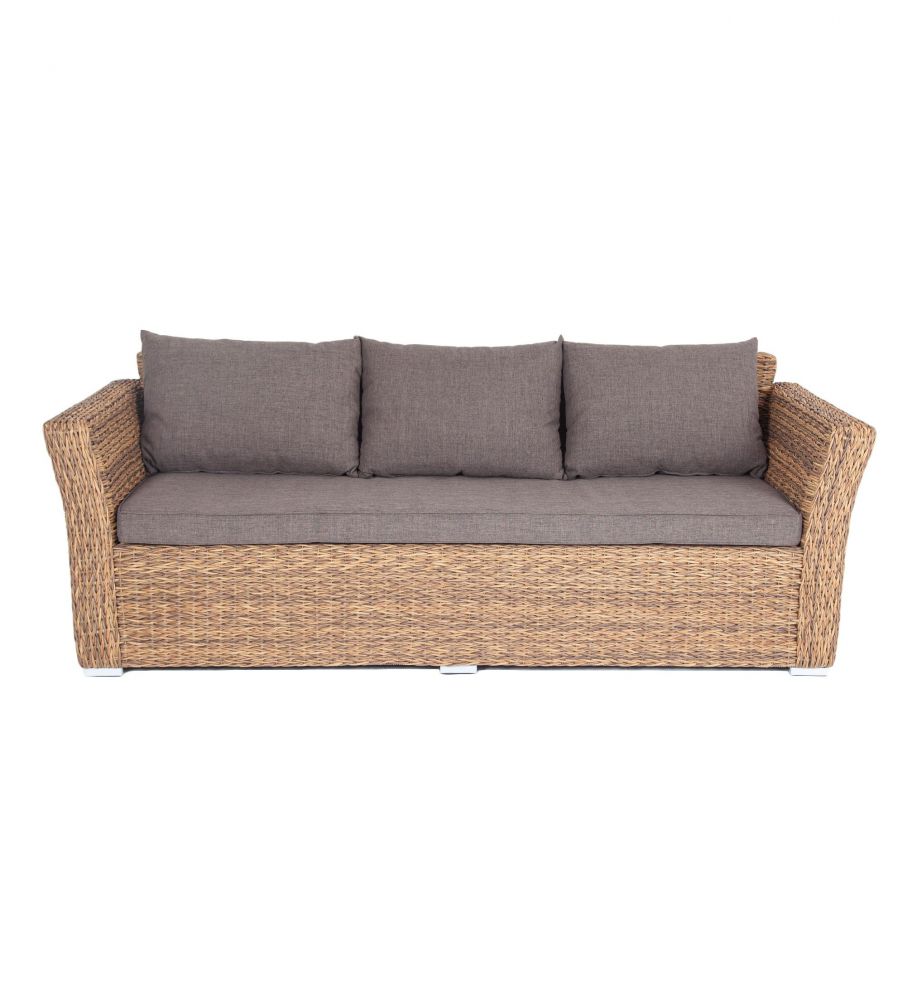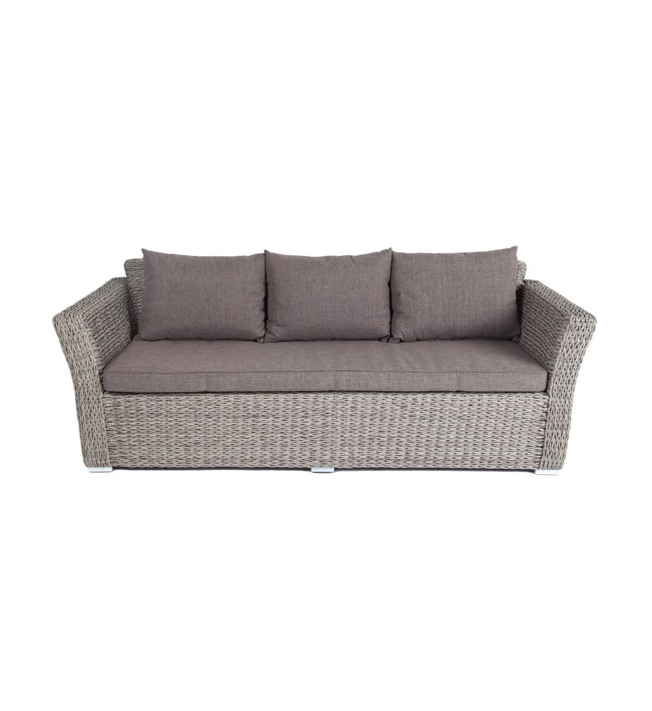 Диван из искусственного ротанга «Капучино» серого цвета, расчитан на три персоны. В основании - прочный каркас из алюминия, оплетенный вручную искусственным ротангом вида "гиацинт". В комплектацию входят подушки, пропитанные специальным влагоотталкивающим составом.