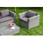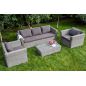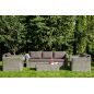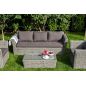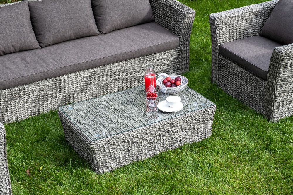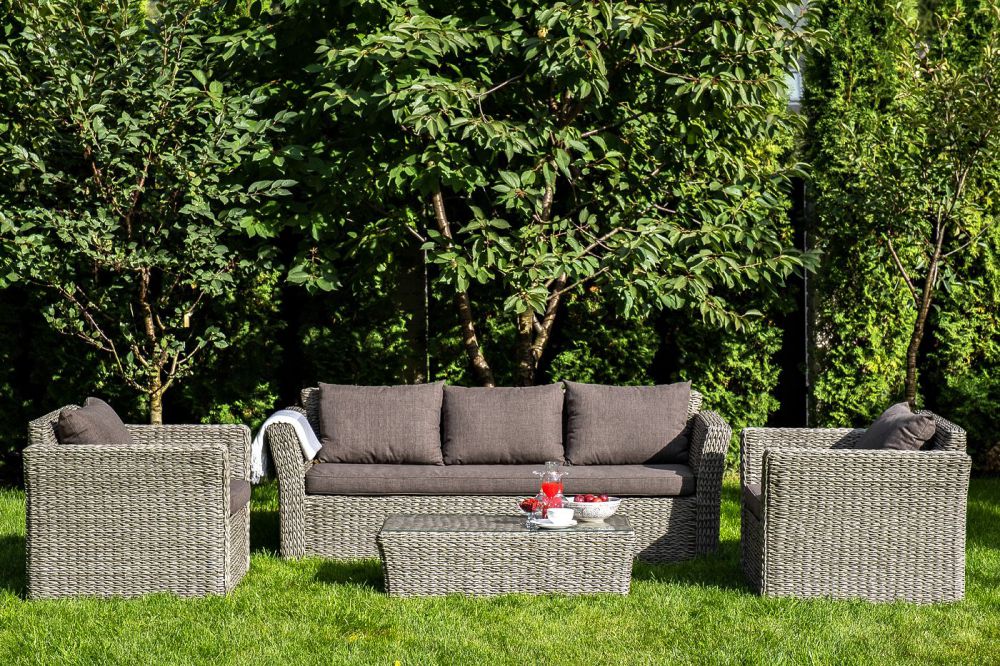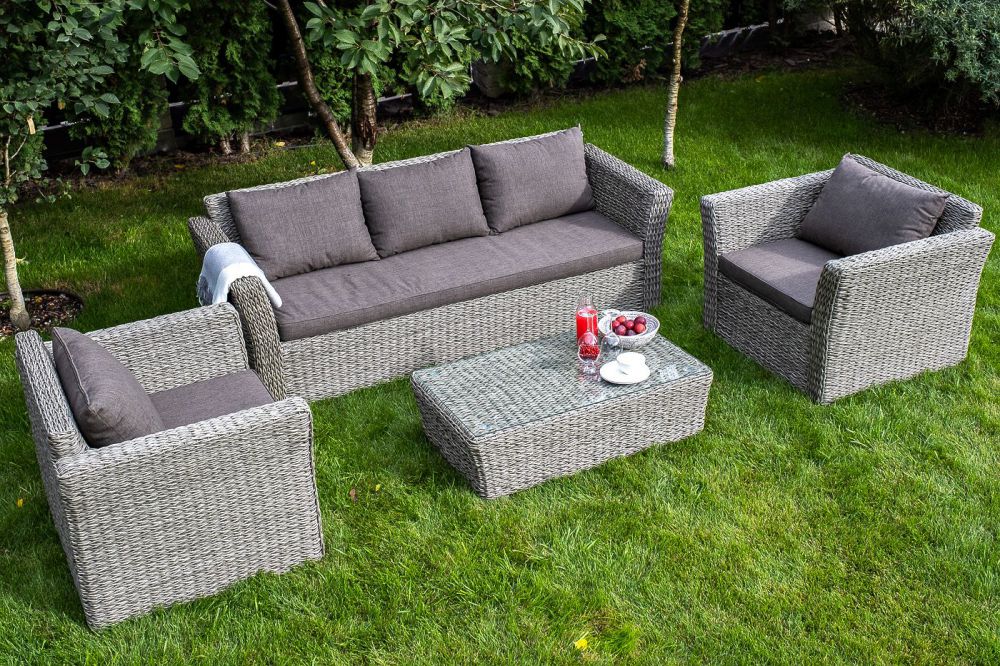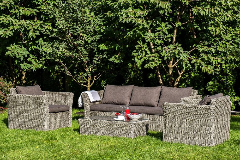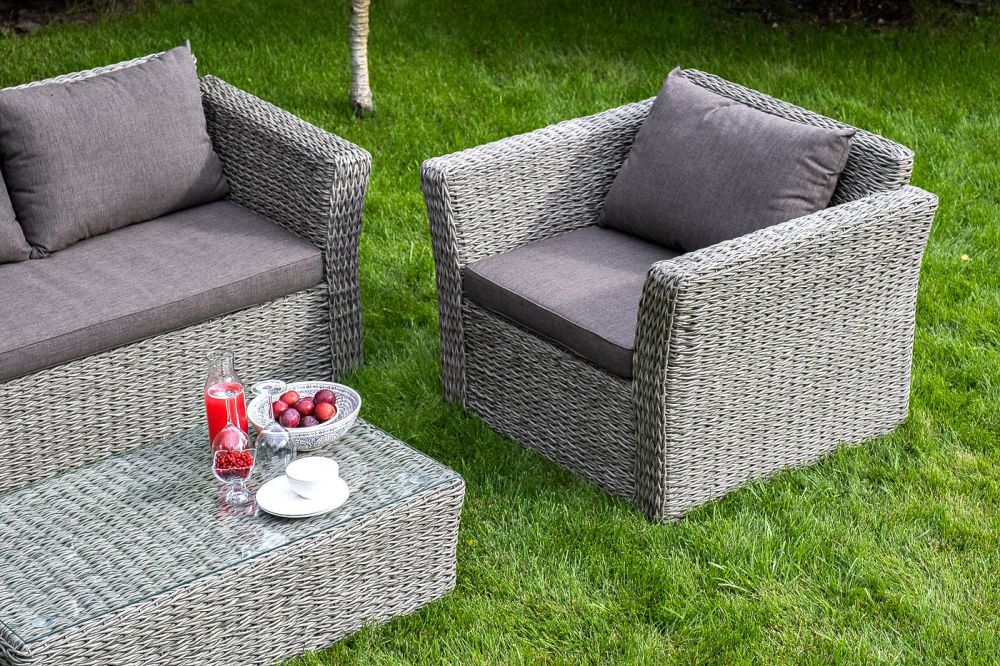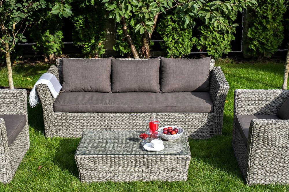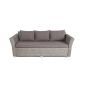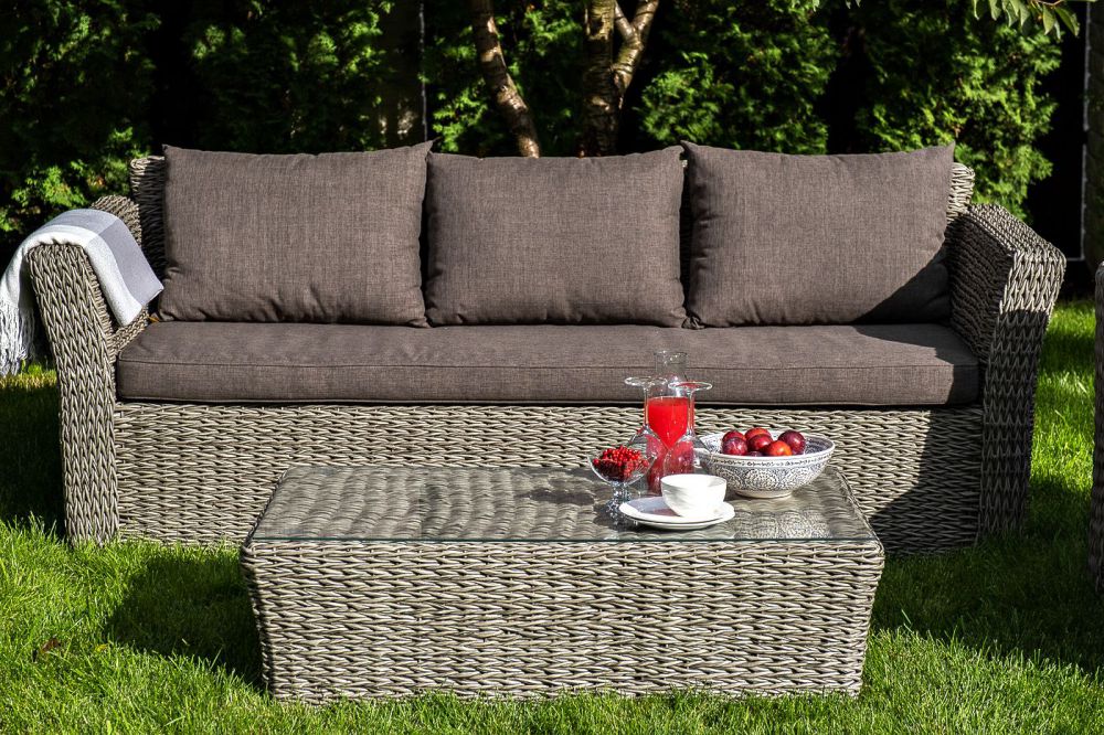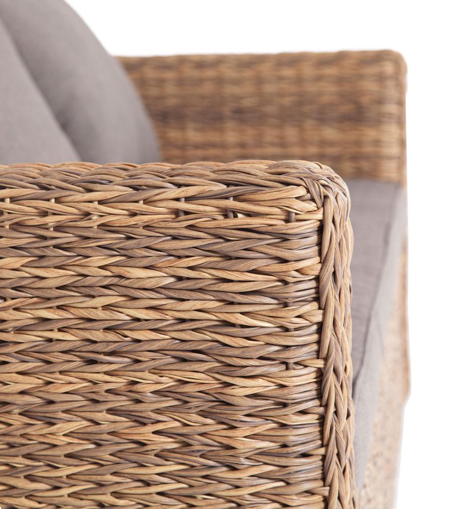 Диван из искусственного ротанга «Капучино» серого цвета, расчитан на три персоны. В основании - прочный каркас из алюминия, оплетенный вручную искусственным ротангом вида "гиацинт". В комплектацию входят подушки, пропитанные специальным влагоотталкивающим составом.
