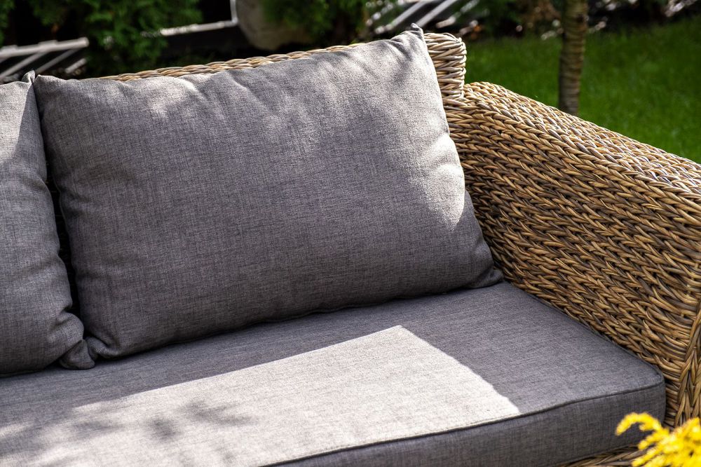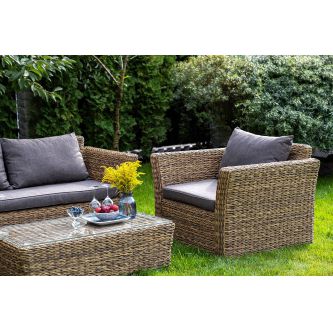 Кресла и диван идут в комплекте с подушками с серо-коричневыми чехлами. Они пошиты из качественного полиэстера с плотностью 230гр/м2. Материал предварительно проходит обработку влагоотталкивающей пропиткой. Столик дополнен практичной столешницей из стекла толщиной 5 мм.