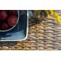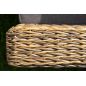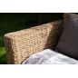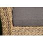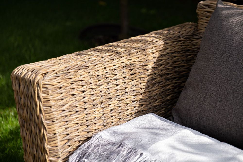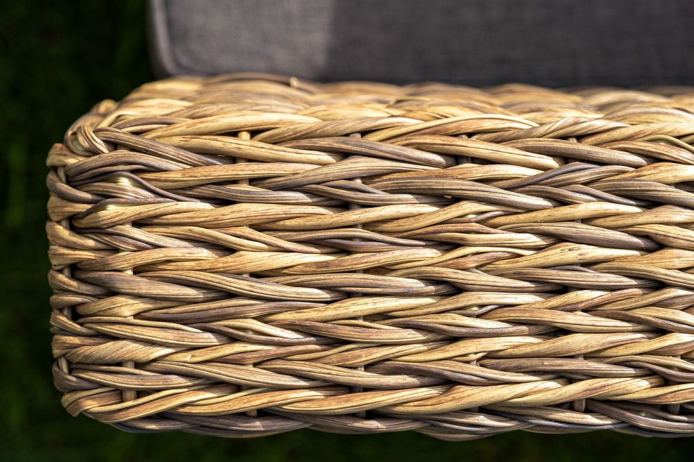 Из алюминия сделан устойчивый каркас мебели. Ее поверхность дополнена искусственным ротангом вида "гиацинт", из которого сделано ручное плетение, цвет соломенный.