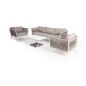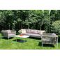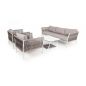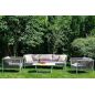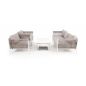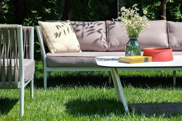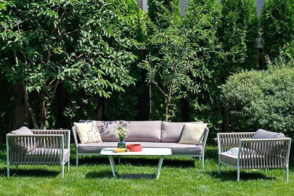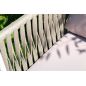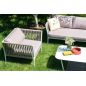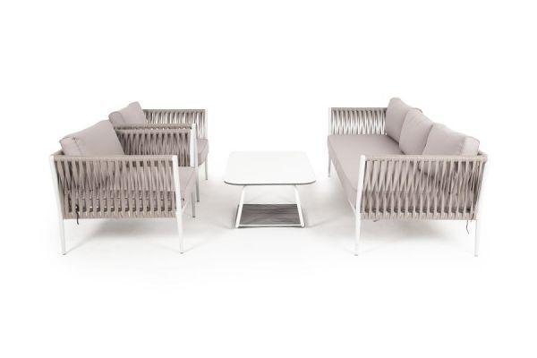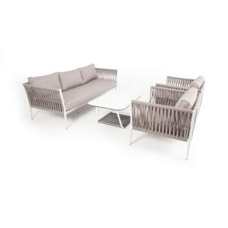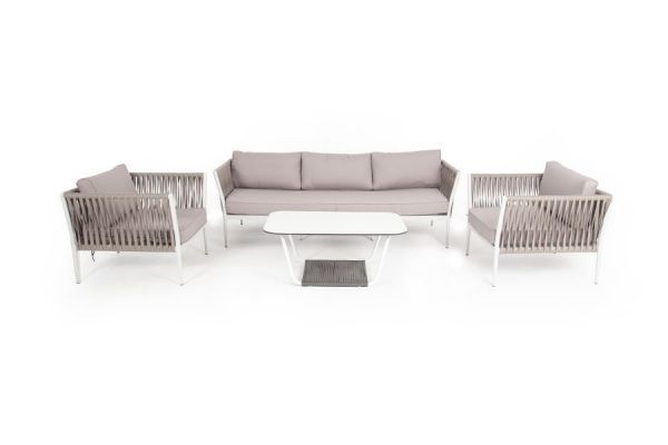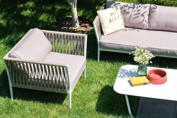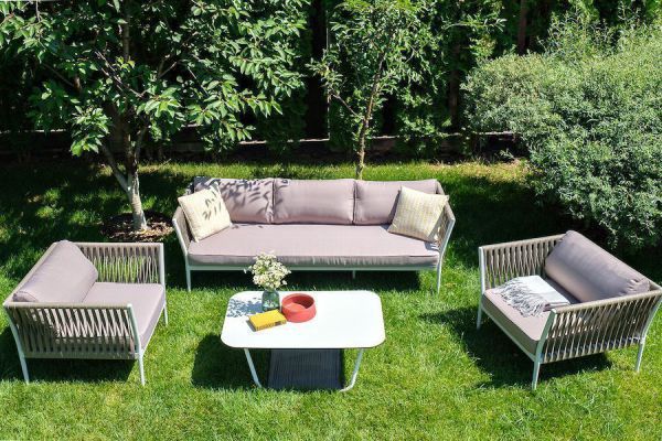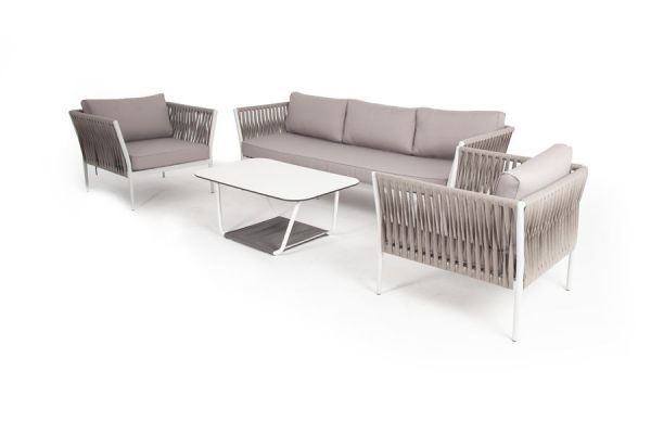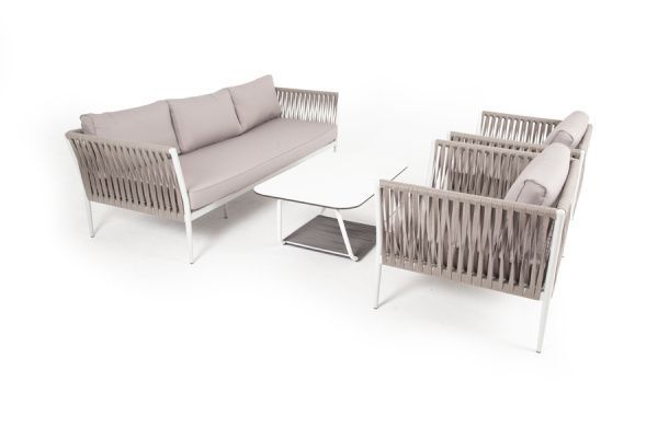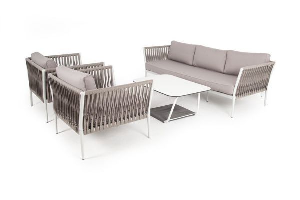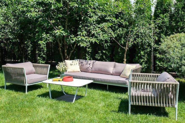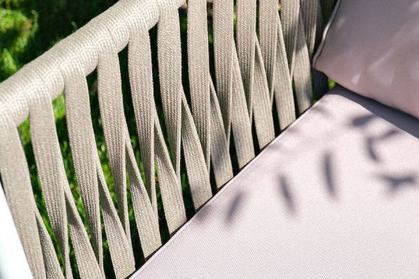 Диван и кресла изготовлены их алюминиевого прочного каркаса, оплетенного ручным способом роупом серо-коричневого цвета. Это эластичные ленты из полиэфирных волокон высокого качества. Каркас окрашен в белый цвет износостойкой порошковой краской.