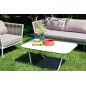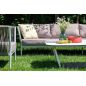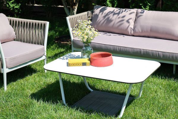Журнальный столик также имеет алюминиевый каркас белого цвета. Столешница выполнена из монолитного компакт-пластика HPL молочного оттенка. Нижняя часть столика задекорирована роупом серого цвета и представляет дополнительную полку для хранения.