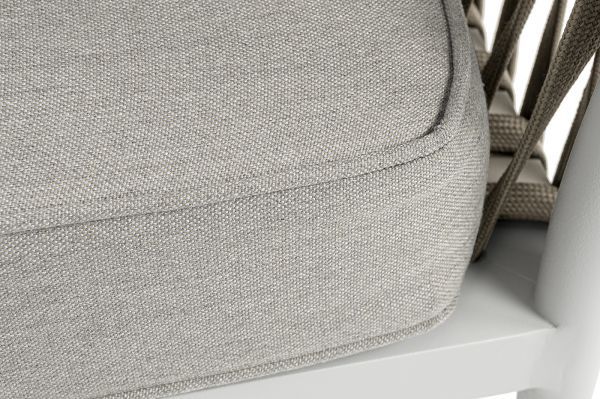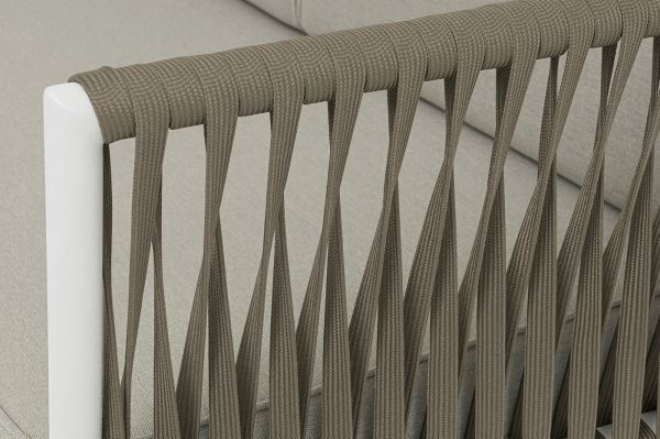 Диван имеет алюминиевый каркас, окрашенный порошковой краской в светло-серый цвет. Боковины каркаса вручную оплетены плоским роупом - эластичными синтетическими лентами, изготовленными из высокопрочных полиэфирных волокон. Цвет оплетки - серо-коричневый.