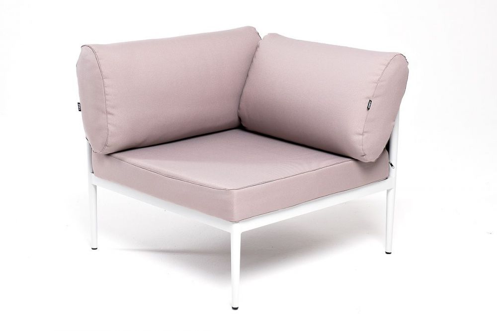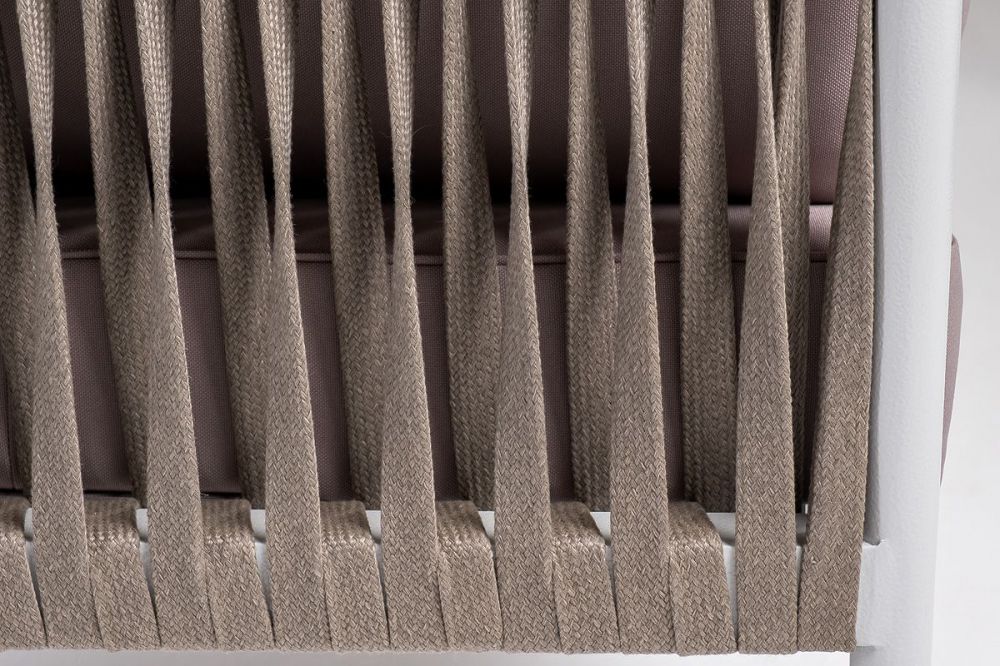 Модуль диванный угловой входит в комплект трансформирующегося дивана "Касабланка". Изготовлен из качественного алюминиевого профиля, окрашенного порошковой краской в светло-серый (RAL7035) цвет. Каркас оплетен плоским роупом, шириной 23 мм, серо-коричневого цвета.
