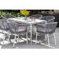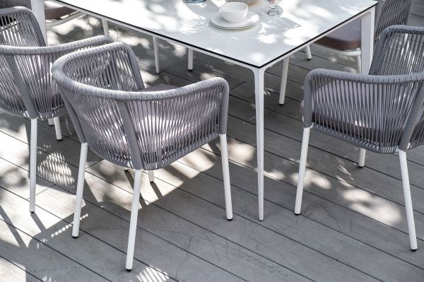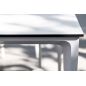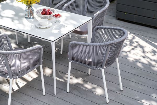 Столешница выполнена из современного высококачественного монолитного компакт-пластик HPL, толщиной 12 мм в молочном цветом. Материал устойчив к высоким температурам, попаданию влаги и может использоваться при любых погодных условиях. Подстолье изготовлено из крашеного алюминия белого цвета.