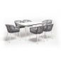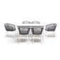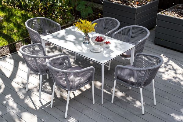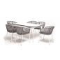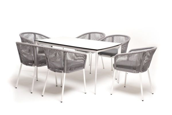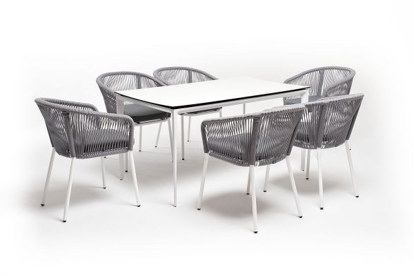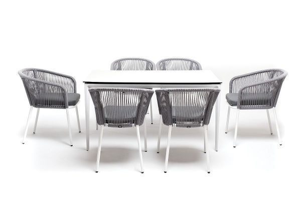 В состав комплекта входит: - Стол "Малага" со столешницей из HPL-пластика, размер столешницы - 1400х800 мм, цвет - молочный. Высота стола - 750 мм - 6 плетеных стульев "Марсель" из роупа, размером - 570х620х775 мм, цвет роупа - светло-серый, каркас - белый.