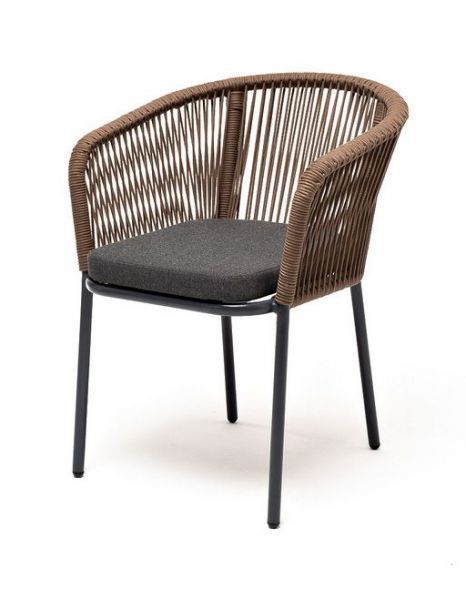 Стул "Марсель" предназначен для организации обеденной зоны или зону лаунж. Выполнен из алюминиевого каркаса серого (RAL7022) цвета. Оплетка - современный материал "роуп", которым каркас оплетался вручную. Роуп - это эластичные синтетические ленты, изготовленные из высокопрочных полиэфирных волокон. Цвет оплетки - коричневый.