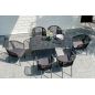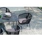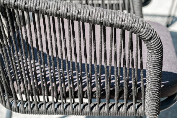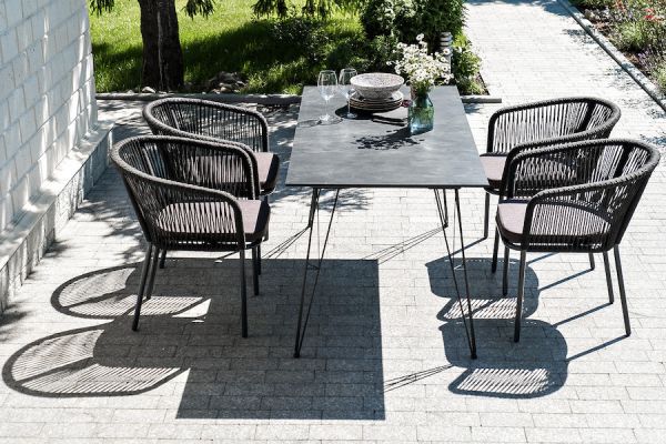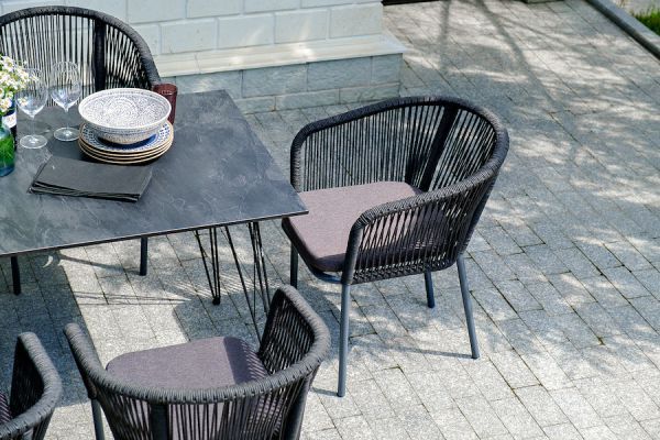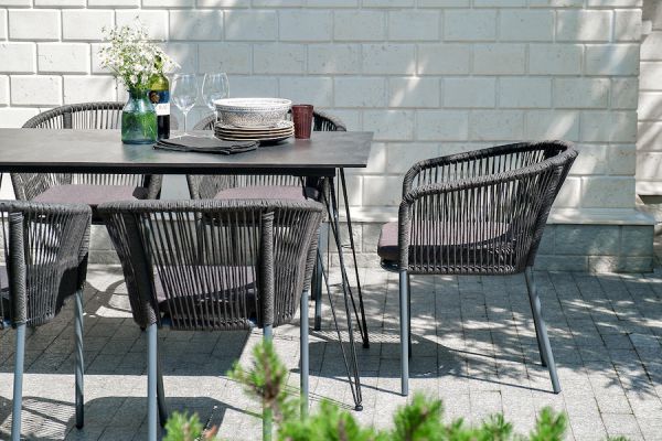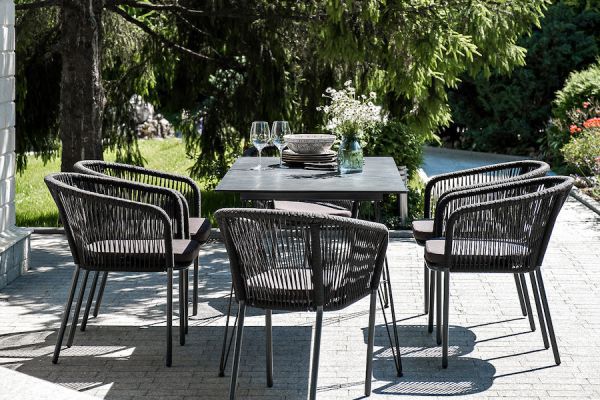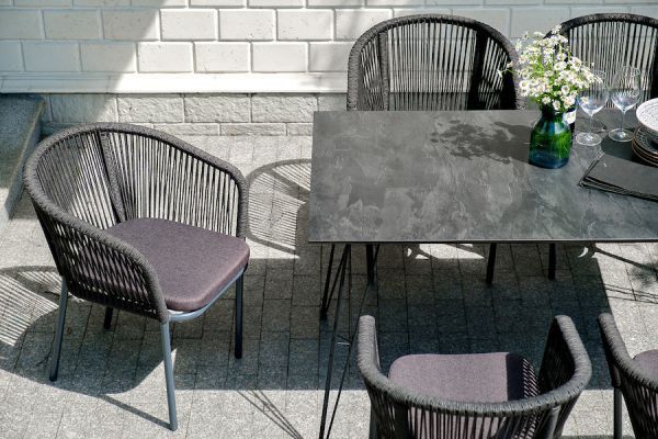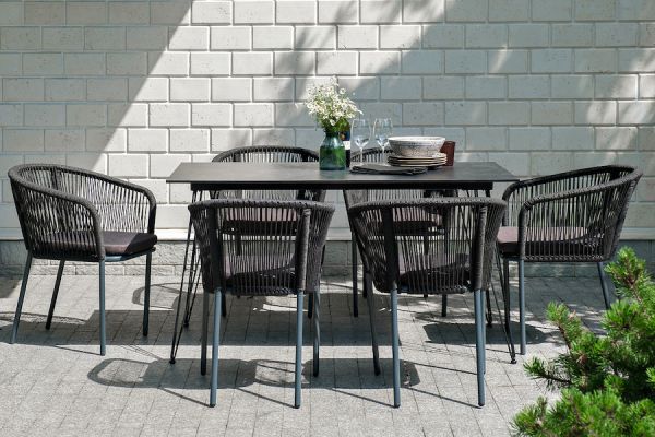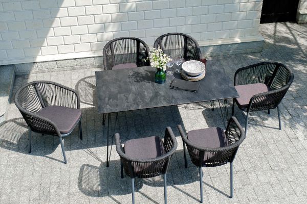 Комплект «Милан» для обустройства обеденной зоны, рассчитан на 6 персон. Столешница стола выполнена из высококачественного монолитного компакт-пластика HPL. Его толщина - 12 мм, цвет - «черный мрамор», ножки - из металла. Каркас стульев - алюминиевый, оплетен вручную современным материалом - роупом. Это эластичные синтетические ленты из высокопрочных полиэфирных волокон. В комплект входят подушки со съёмными водоотталкивающими чехлами серого цвета.
