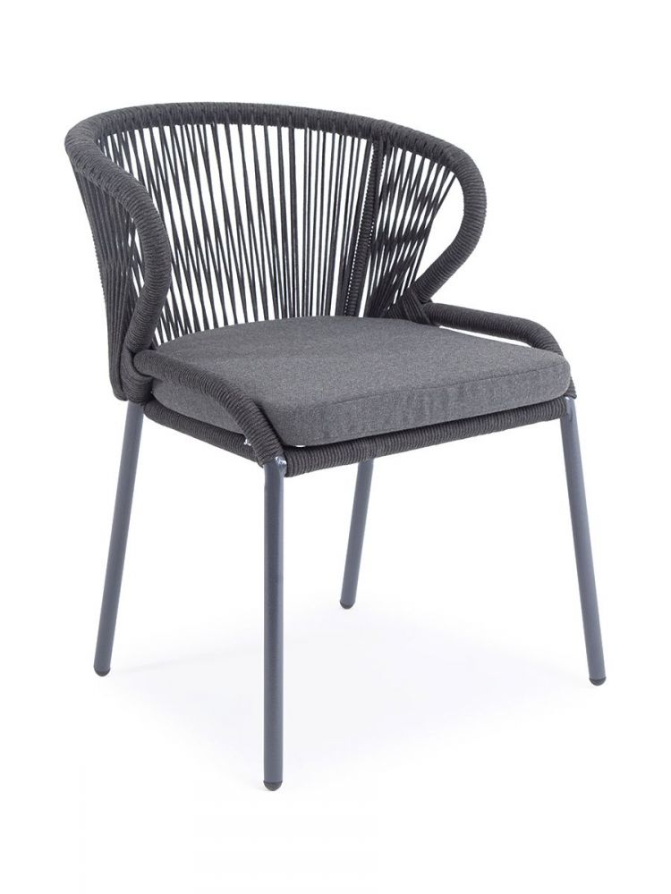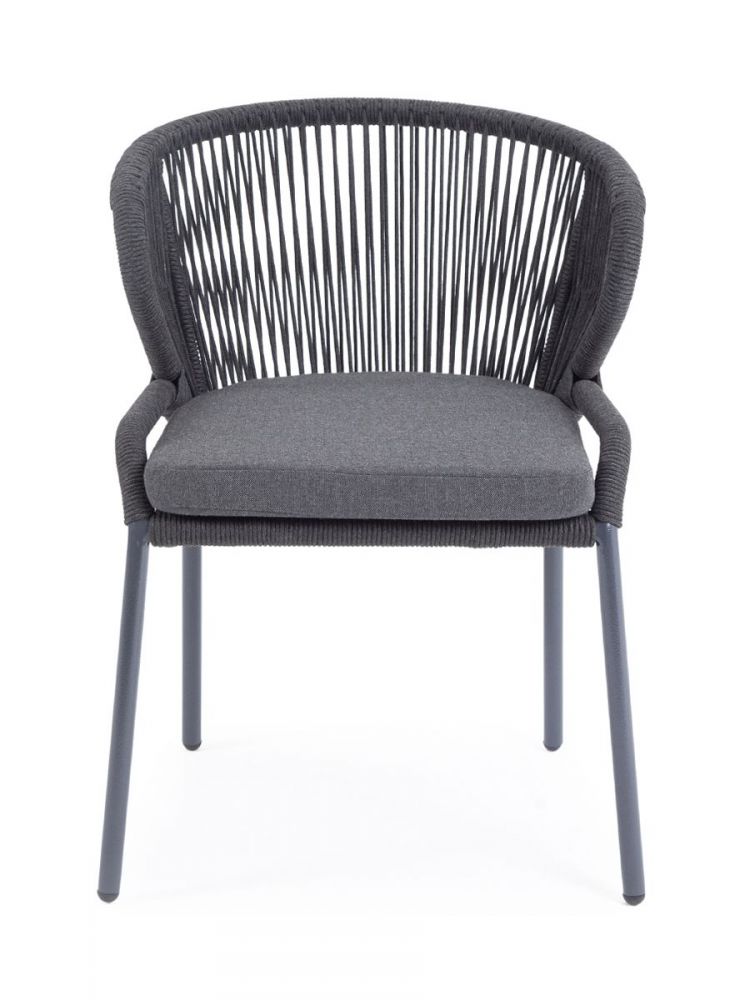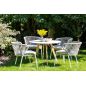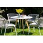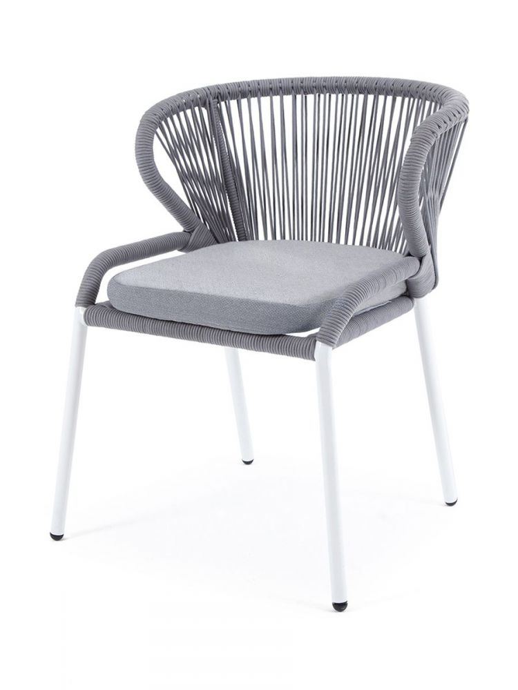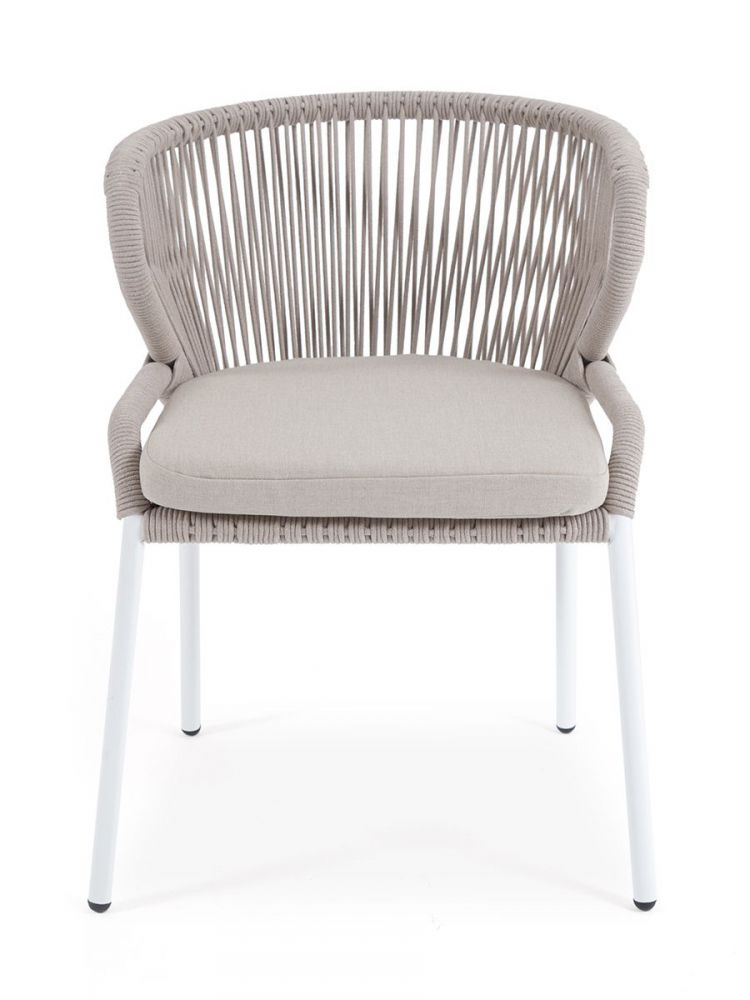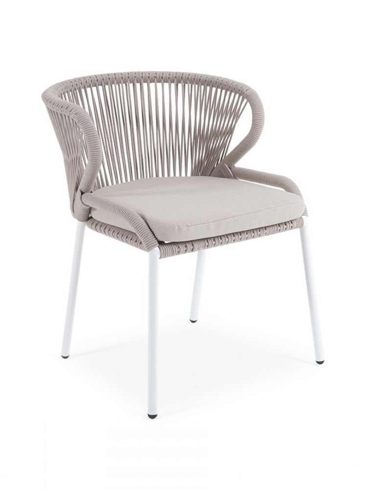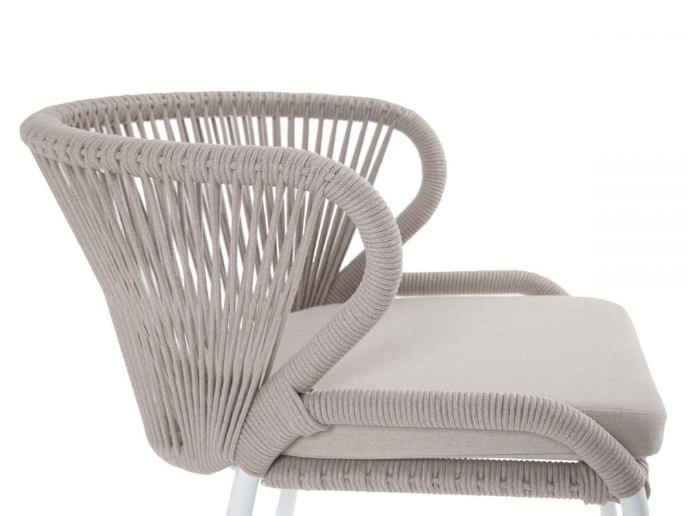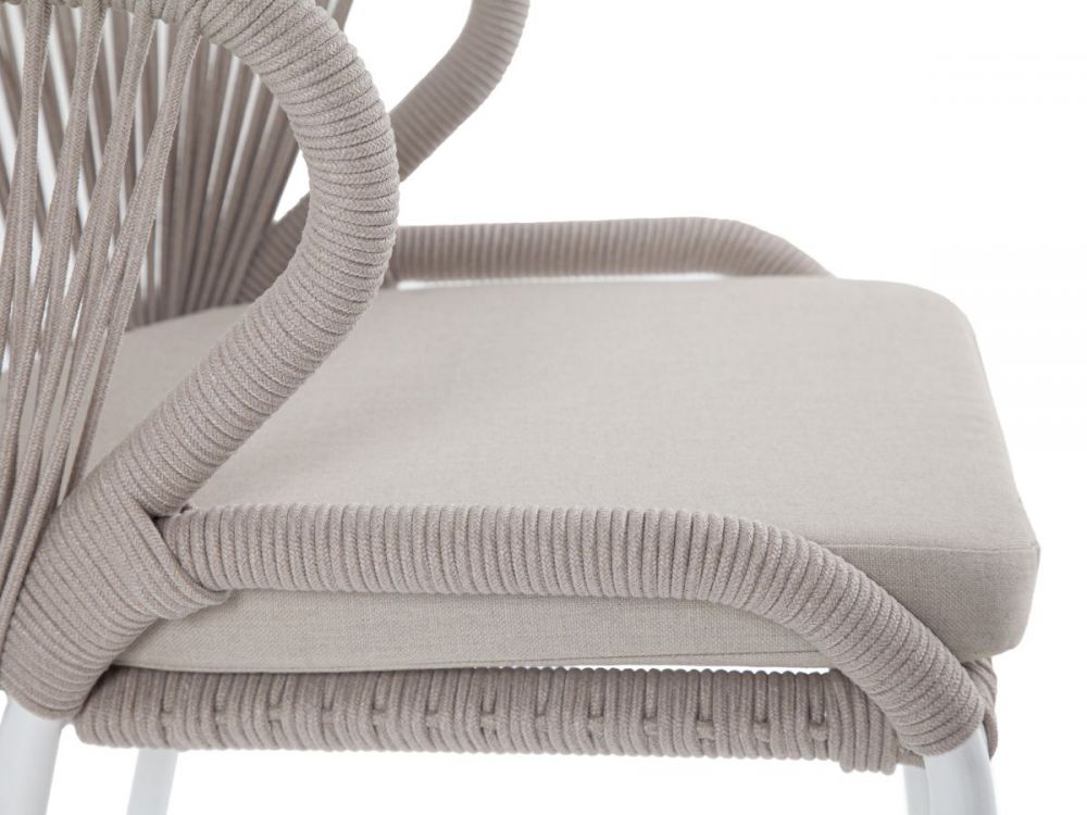 Стул "Милан" для обустройства обеденной или лаунж-зоны. Изготовлен из алюминиевого каркаса, оплетенного вручную эластичными синтетическими лентами из высокопрочных полиэфирных волокон (роуп круглый). Цвет каркаса - белый, оплетки - бежевый.