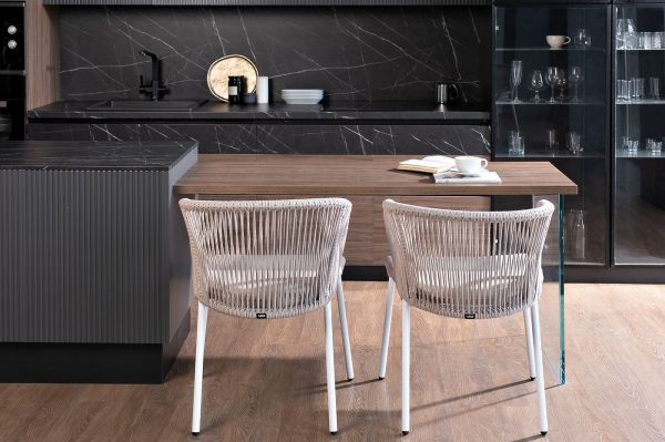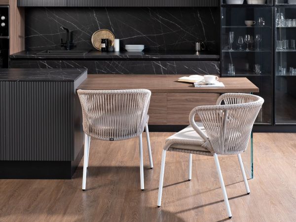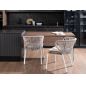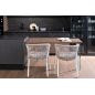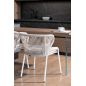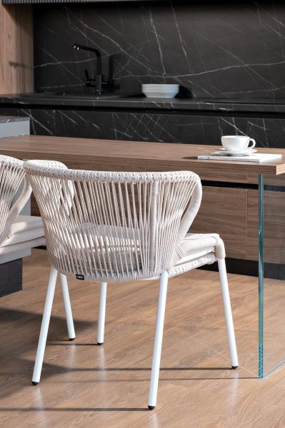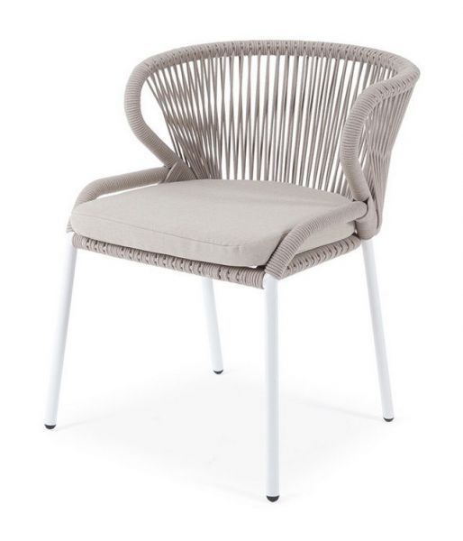 Стул "Милан" для обустройства обеденной или лаунж-зоны. Изготовлен из алюминиевого каркаса, оплетенного вручную эластичными синтетическими лентами из высокопрочных полиэфирных волокон (роуп круглый). Цвет каркаса - белый, оплетки - бежевый.