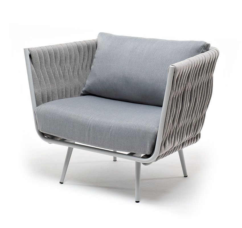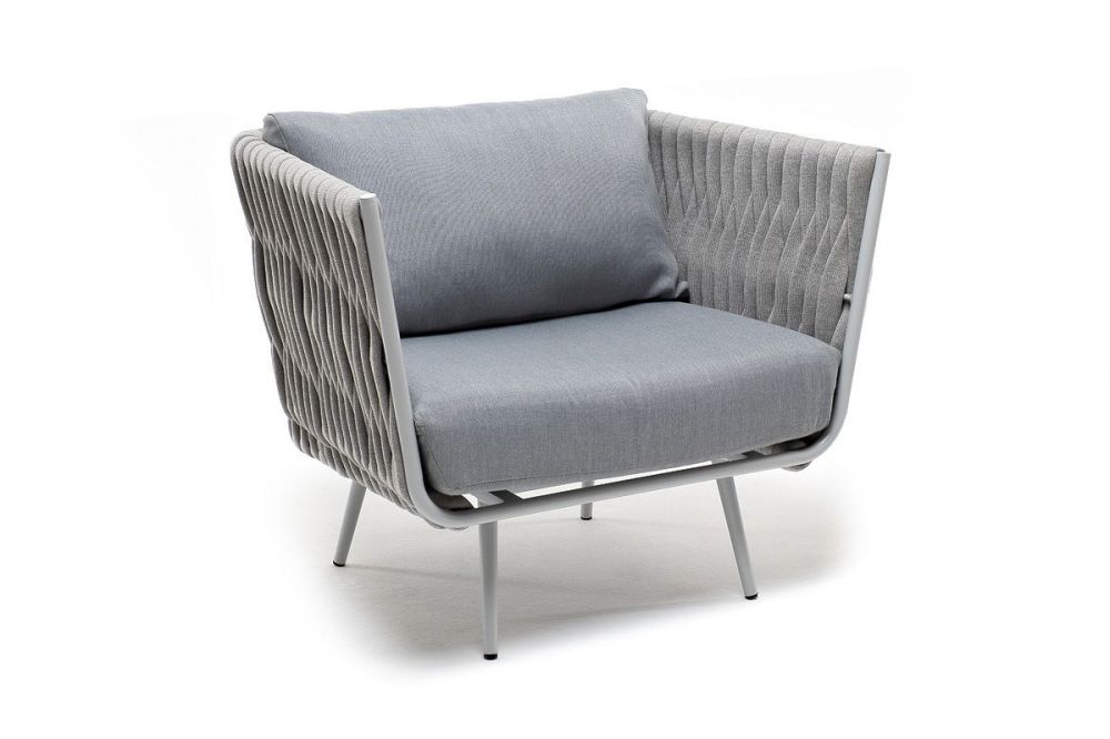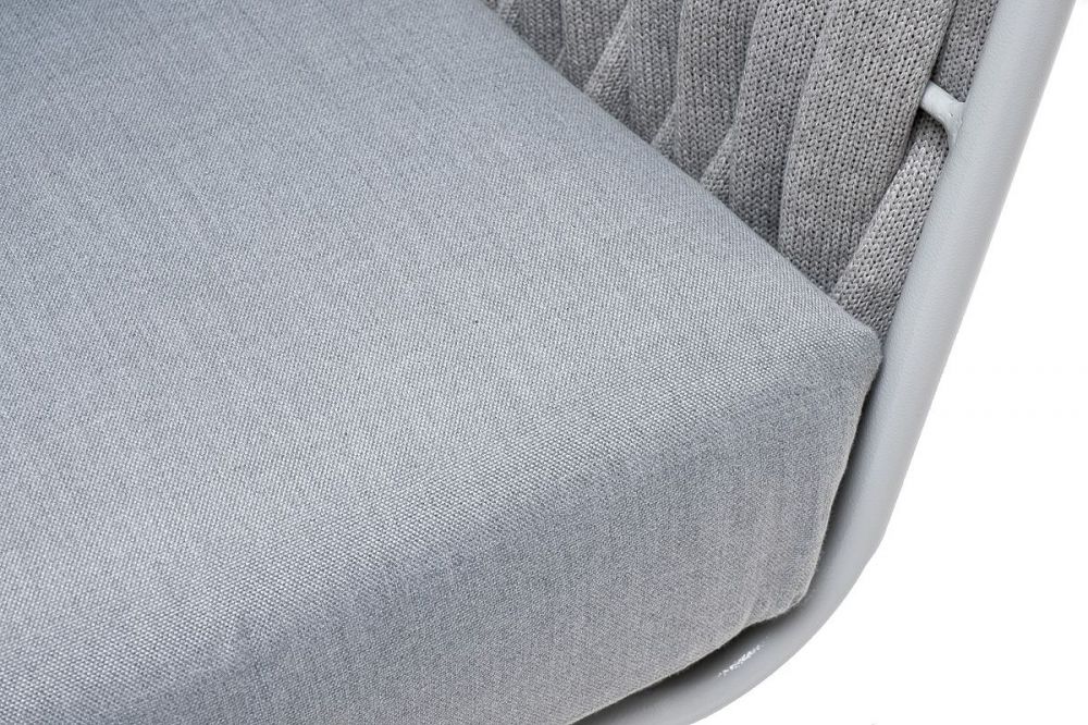 Плетеное кресло "Монако" для обустройства обеденной или лаунж-зоны. Изготовлен из алюминиевого каркаса, оплетенного вручную эластичными синтетическими лентами из высокопрочных полиэфирных волокон. Цвет каркаса и оплетки – светло-серый.