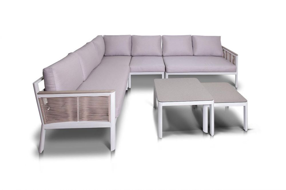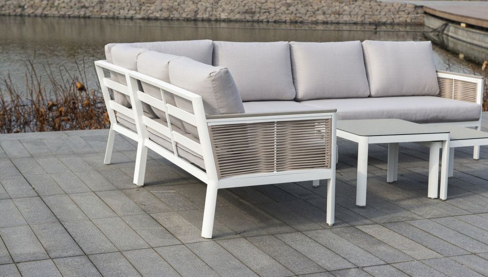 Диван можно трансформировать под нужный размер и расположение. Состоит из алюминиевого каркаса белого цвета, который дополняет бежевая оплетка из эластичных синтетических лент, состоящих из высокопрочных полиэфирных волокон.