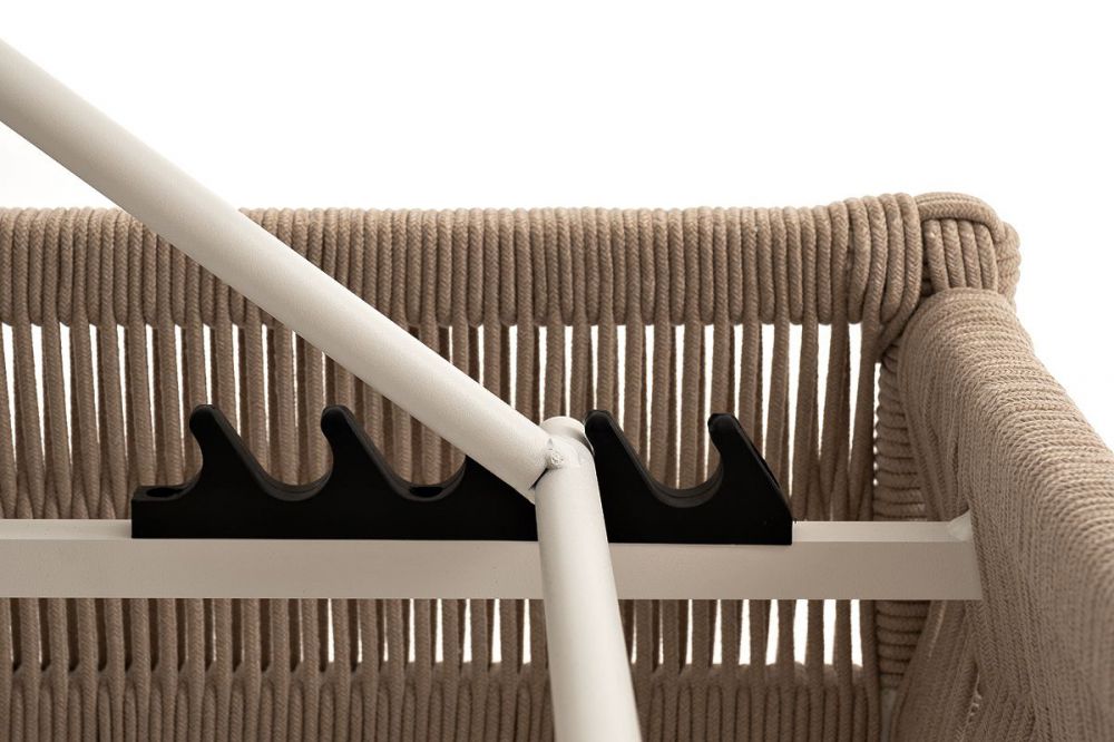 "Ривьера" плетеный шезлонг из роупа бежевого оттенка прекрасно дополнит пространство для отдыха на открытом воздухе. Изготовлен из алюминиевого каркаса, окрашенного порошковой износостойкой краской белого цвета. Каркас вручную оплетен бежевым роупом - эластичными синтетическими лентами из высокопрочных полиэфирных волокон.