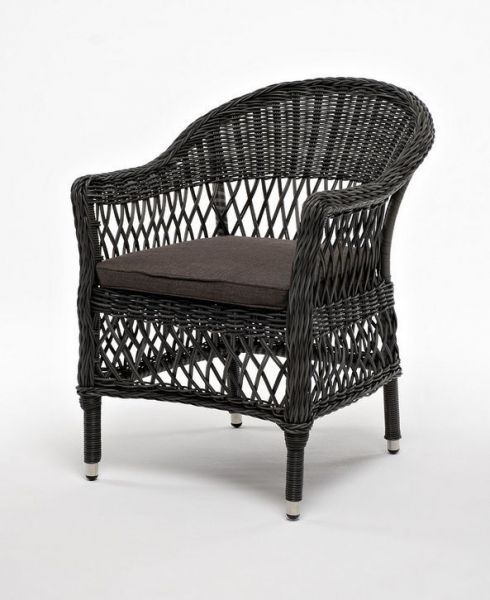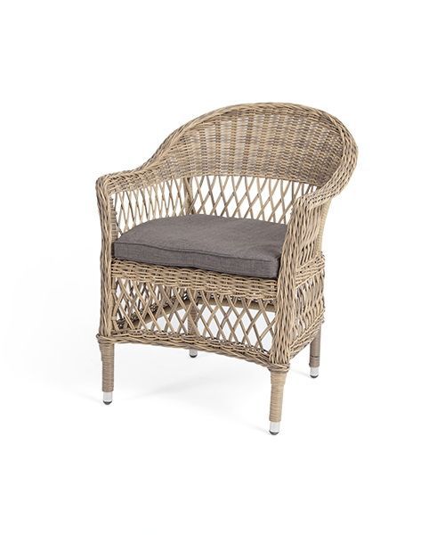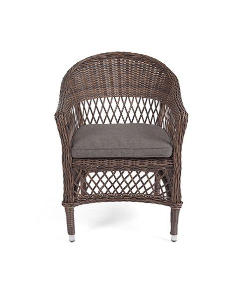 Стул оплетен вручную круглым искусственным ротангом коричневого оттенка. В комплекте представлена мягкая подушка-сиденье серо-коричневого цвета. Подушка имеет съемный чехол из полиэстера (100%), плотностью 230гр/м2, с влагоотталкивающей пропиткой.