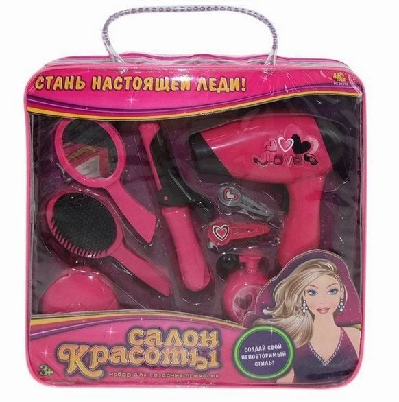 Этот игровой набор станет шикарным подарком для истинной маленькой модницы. Он содержит множество разнообразных предметов и аксессуаров, таких как, фен, зеркальце, расчёску, плойку, заколочки, флакончик для парфюма, пудренницу.
