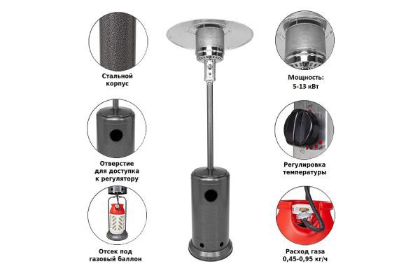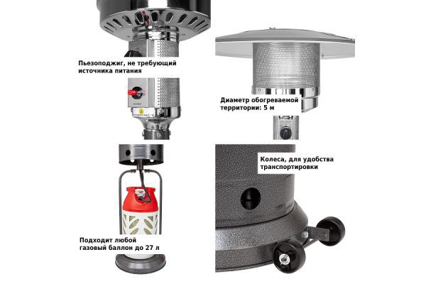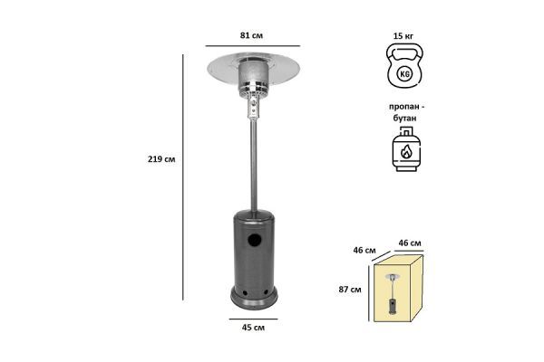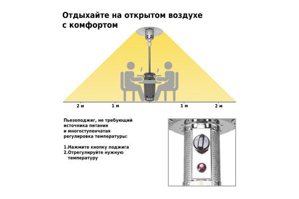 Уличный газовый обогреватель A-01T согреет прохладными вечерами на открытых верандах кафе, в лаунж-зонах при отелях, при проведении загородных мероприятий, в садовых беседках и патио. С ним отдых на открытом воздухе станет комфортным и уютным.