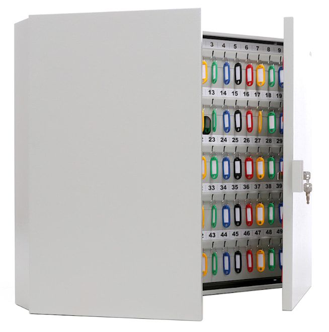 Изготовлена из листовой стали толщиной 0,9 мм. Запирается врезным ключевым замком, в комплект входят два ключа. Для размещения ключей используются металлические крючки. В комплекте идут разноцветные пластиковые брелоки (600 штук) и самоклеющимиея номерки.