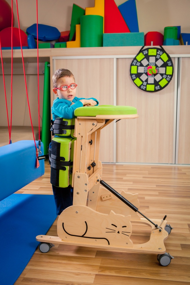 Передний вертикализатор Котенок I KT-1 создан с мыслью о детях, вынужденных все время лежать. Он позволяет им принимать положение стоя, что дает ребенку возможность по-новому познавать окружающий мир и стимулирует его психофизиологическое развитие. Пневматический сервопривод помогает выставить нужный наклон устройства и значительно облегчает контроль над ребенком в устройстве. Расширенная система подушек и ремней безопасности обеспечивает ребенку чувство безопасности и уверенности. В заботе о ребенке продукт изготовлен из экологичных, безопасных материалов и разрисован вручную.
