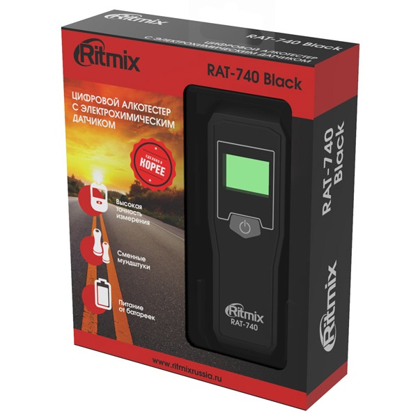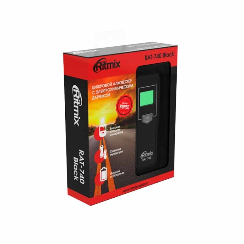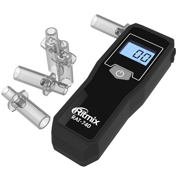 Ritmix RAT-740 — компактный цифровой алкотестер с усовершенствованным электрохимическим датчиком, предназначенный для проведения индивидуального измерения концентрации алкоголя в парах выдыхаемого воздуха. Прибор пересчитывает полученные данные на концентрацию алкоголя в крови и выдаёт результат на цифровой дисплей.
