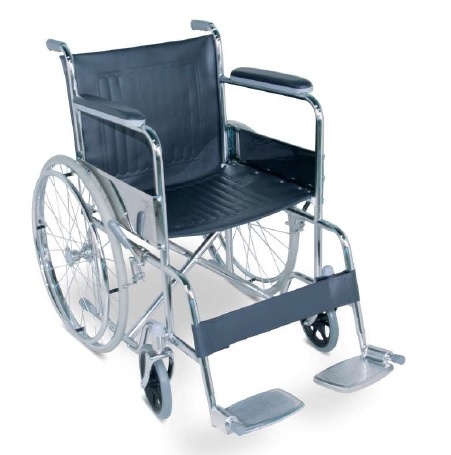 Кресло-коляска AMRW18P-EL - полноценная комнатная и прогулочная коляска для инвалидов. Складная, с ручным приводом, подлокотники и подножки фиксированные, имеется опора для ног и голеней, стояночный тормоз обоих задних колес. Изготовлена из хромированной стали, сидение и спинка – ПВХ.