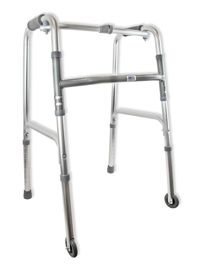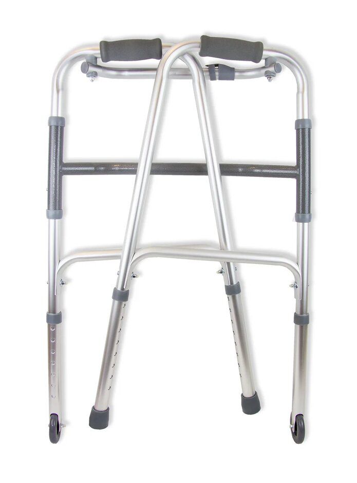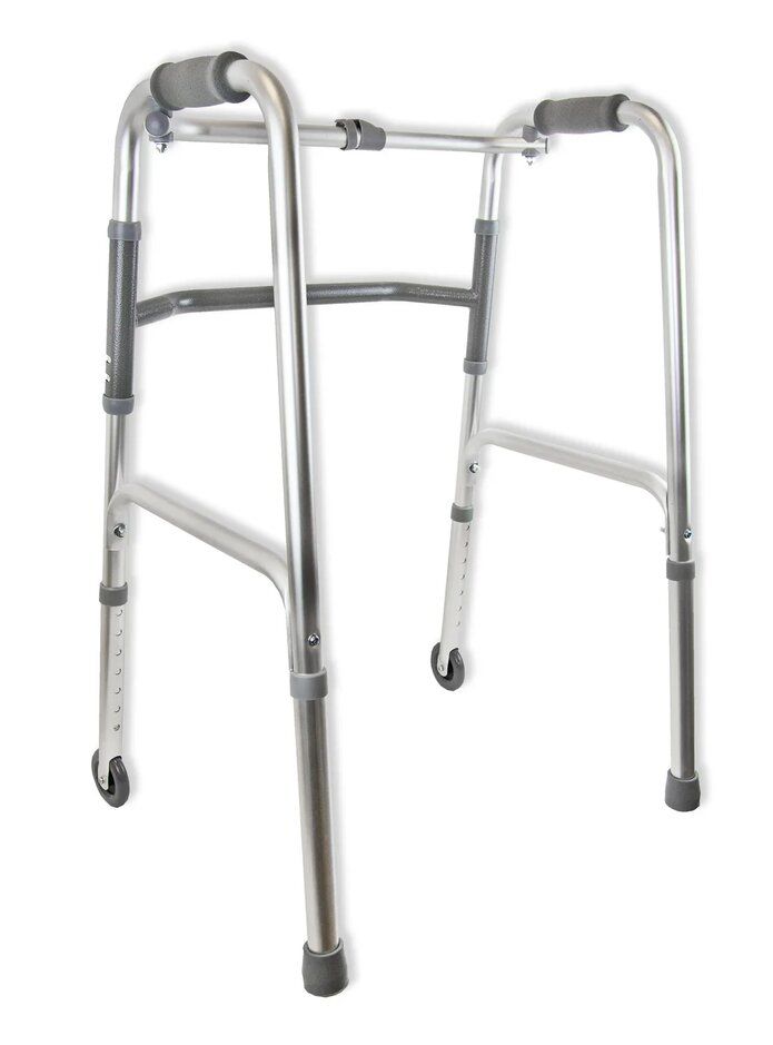 Ходунки с колесами рекомендуются для использования пожилыми и ослабленными людьми в период реабилитации после травм и болезней. Передние колеса избавляют от необходимости поднимать опоры, что особенно важно для людей с ослабленными руками. Снабжены удобными мягкими накладками на поручни и резиновыми наконечниками против скольжения. Данная модель на двух опорах и двух колесах.
