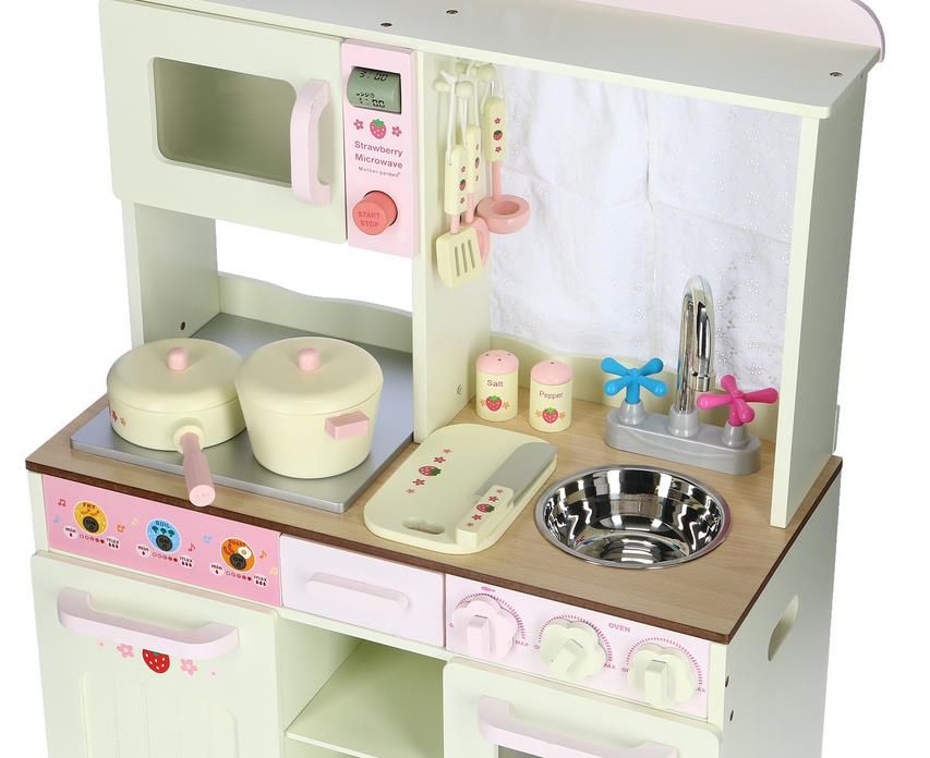 Современный игровой кухонный гарнитур. Кухня выполнена в приятных и современных оттенках. В комплект входит набор посуды. Все шкафчики открываются, вентели крутятся, внутри шкафов есть полочки. При небольших габаритах кухня имеет в себе все необходимое для полноценной игры.