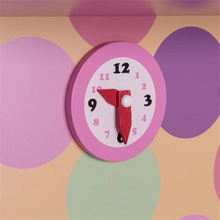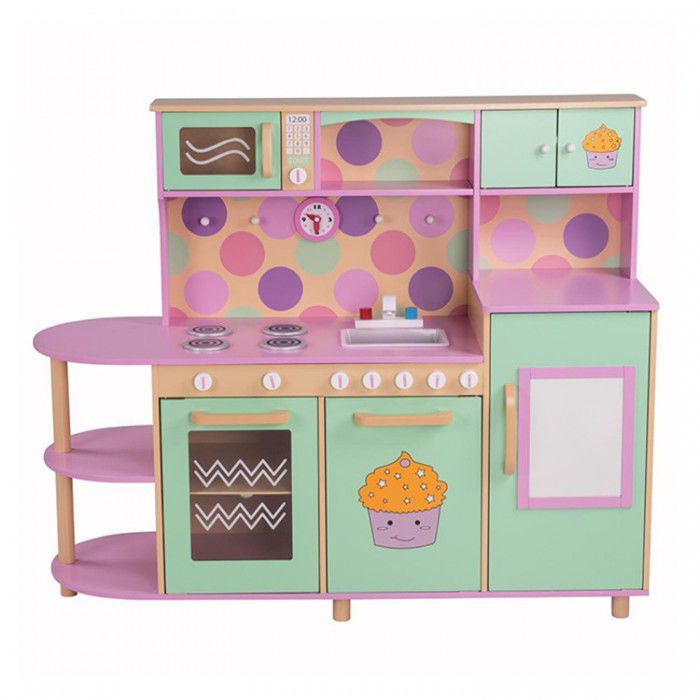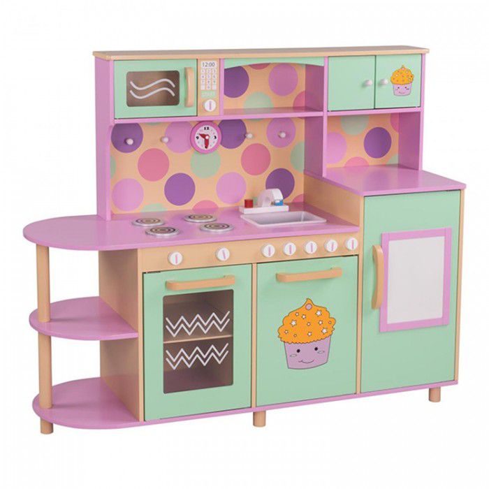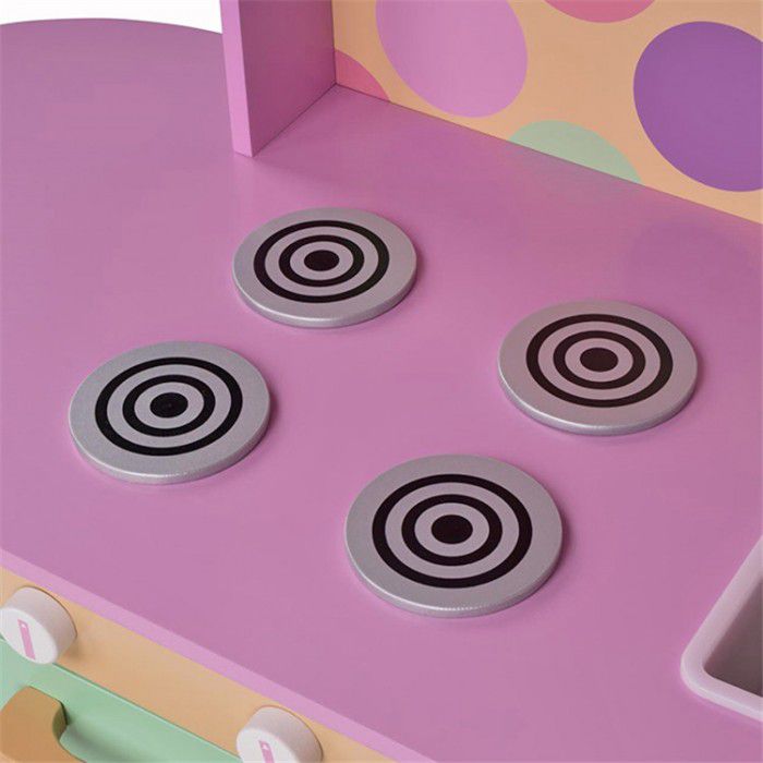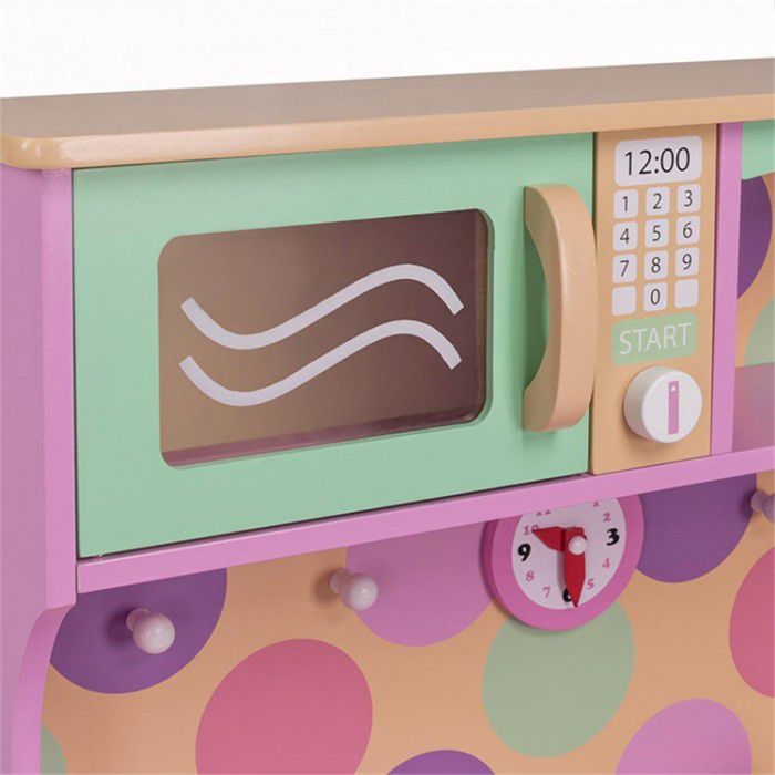 Цветовая палитра кухни состоит из 4 основных оттенков- розового, лилового, мятного и кремового. Расцветка не однотонная, но очень мягкая - поэтому идеально сочетается практически с любым дизайном детской комнаты. Кухня имеет всё, что необходимо настоящим "взрослым" гарнитурам - большие удобные ручки, открытые и закрытые полочки, прозрачное окошко в духовке, полукруглую "барную" законцовку столешницы и даже часики! Высокая розовая столешница (50 см) рассчитана на юных хозяек любого роста, в возрасте от 3 до 10 лет.