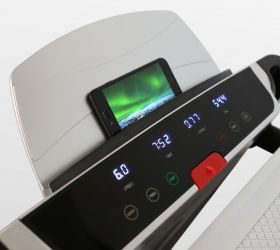 Разнообразить тренировку поможет мультимедийная составляющая - в консоль дорожки установлены колонки мощностью 3 Ватт. Для прослушивания музыки достаточно подключить оборудование к AUX входу. Приятной опцией является подставка под телефон или планшет, а также съемный столик для ноутбуков.
