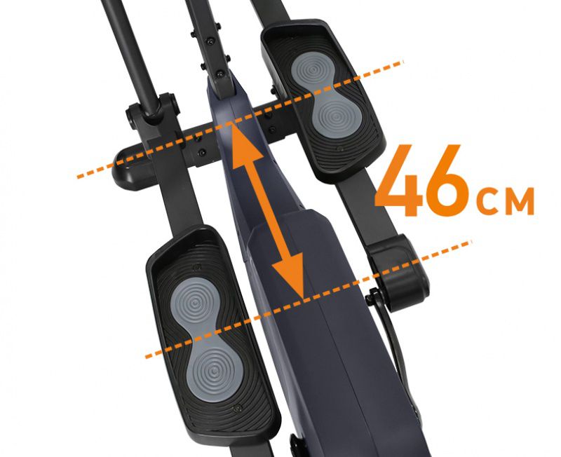 За высокое качество кручения отвечает трехкомпонентный педальный узел и мощный сбалансированный маховик с инерционным весом 24 кг. Длина шага составляет внушительные для домашнего эллипсоида 46 см. Расстояние между педалями (так называемый "малый Q-Фактор S.Q.F. ") составляет всего 18 см - это одно из самых минимальных значений для эллипсоидов с задним приводом.