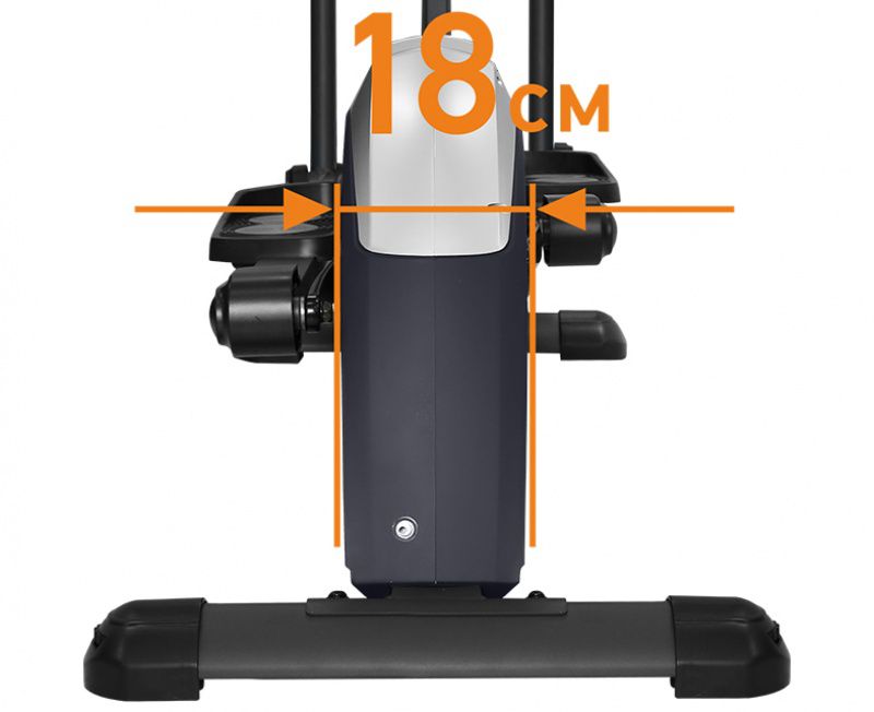 Длина шага составляет внушительные для домашнего эллипсоида 46 см. Расстояние между педалями (так называемый "малый Q-Фактор S.Q.F. ") составляет всего 18 см - это одно из самых минимальных значений для эллипсоидов с задним приводом. Чем меньше такое значение, тем больше тренировка на тренажере приближена к естественным движениям во время бега.