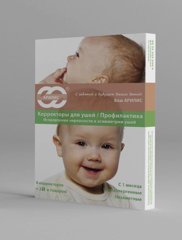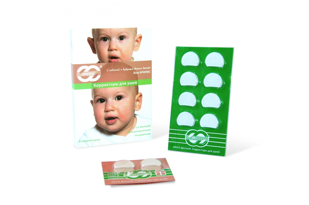 Специализированные корректоры из силикона, смазанного специальным клеем. Предназначены для новорожденных детей. Позволяют бороться с лопоухостью без использования пластической хирургии. Клеятся за ушной раковиной, удерживают ее в нужном положении. Способствует сохранению детской самооценки. Корректоры прозрачные, они не видны во время ношения. Одного корректора хватает на 10 дней, после этого нужно его заменять. В упаковке может быть 4 или 10 штук. Корректоры можно использовать без предварительной консультации с врачом.