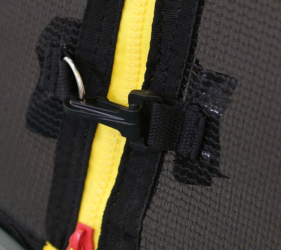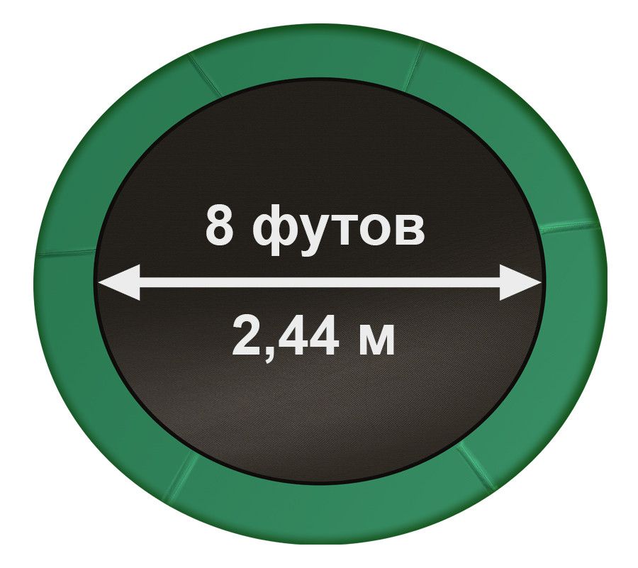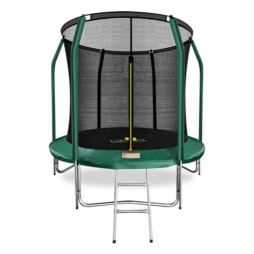 Зона прыжковой поверхности модели составляет 8 футов (2,44 м). На батуте 8FT с внутренней страховочной сеткой (Dark Green) премиальной серии используется легендарный полипропилен Permatron™, произведенный в США, который является самым прочным материалом для прыжковой поверхности. Верхние изогнутые стойки, в количестве 6 штук, оплетены мягкими прорезиненными чехлами из PVC-материала. На верхней части стойки установлены специальные держатели. Они являются составной частью системы натяжения сетки и крепятся при помощи простого нажатия кнопки Smart Push™. По окружности рабочей зоны на стойки натянута прочная внутренняя защитная сетка высотой 170 см. Максимальное натяжение сетки обеспечивает арматура, проходящая по диаметру стоек. В комплекте с батутом предусмотрена лестница длиной 76 см для удобного подъема. Стоит отметить и стильный темно-зеленый цвет модели, подчеркивающий премиальность и высокий уровень качества продукции. Батуты ARLAND легко собираются своими силами.