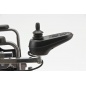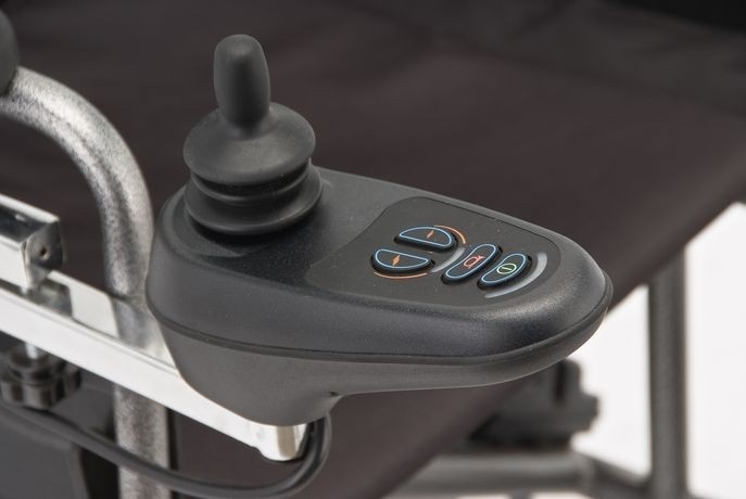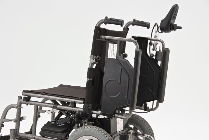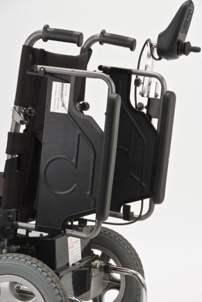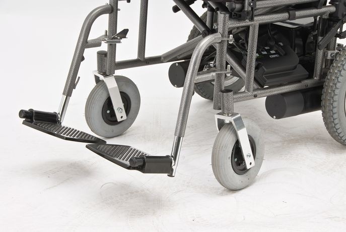 Специальное антиопрокидывающее устройство предназначено для подъемов на небольшую высоту. Колеса с широкими цельнолитыми шинами обеспечивают высокую проходимость коляски. Рама складная, в сложенном виде коляску легко транспортировать в машине. Ткань спинки и сидения износостойкая, устойчивая к воздействию влаги. Аккумулятор размещен в отдельном отсеке.